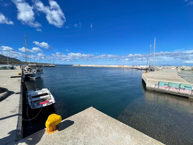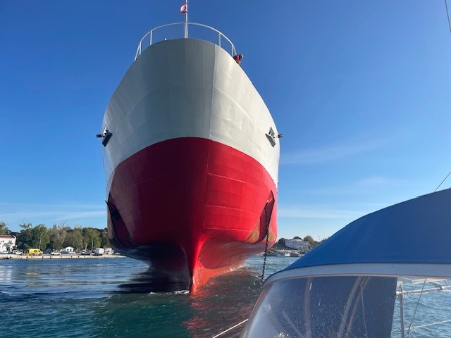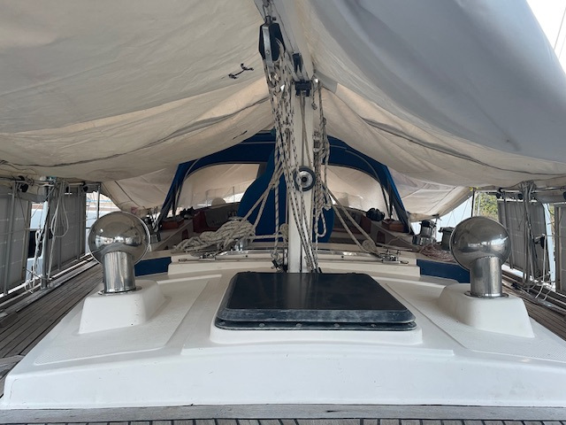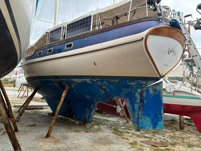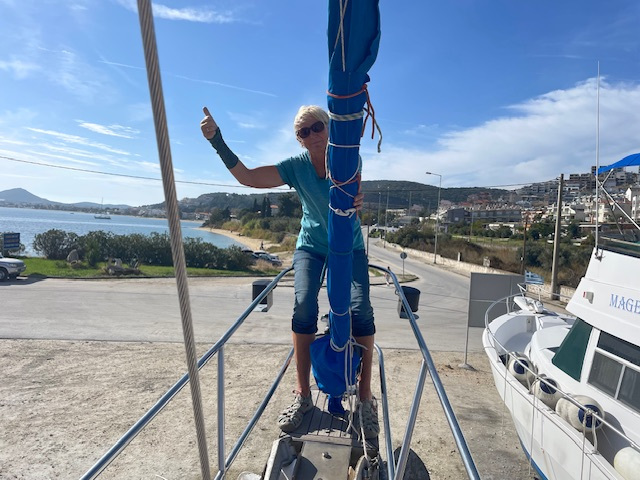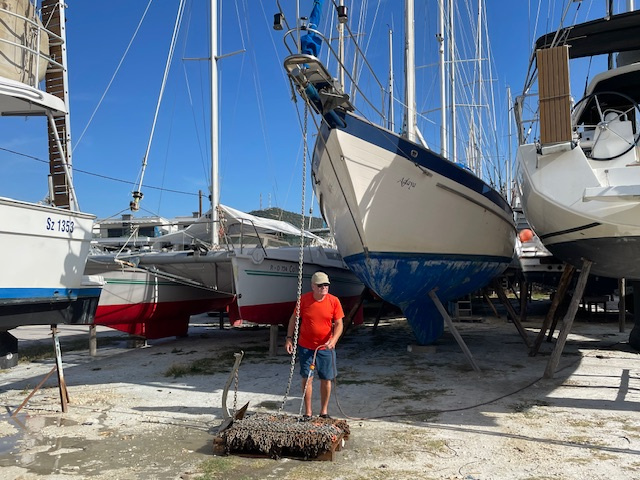 Gestern sind wir mit einem etwas anspruchsvollen Manöver bei Seitenwind und Welle von der Seite in die Box von Manitsas Marine in Nera Peramos gefahren. Spannend war, ob wir so mit unseren zwei Masten in den Travellift passen. Hat geklappt. Vorwärts wäre das nicht gegangen wegen des großen Abstandes zwischen Vorstag und Großmast. Unser Boot ist halt völlig anders von den Maßen her als die Standard-Charterboote. Die Bulgaren, die uns dann mit dem Travellift aus dem Wasser gezogen haben, haben das alles professionell, entspannt, aber mit viel Aufmerksamkeit und Vorsicht hinbekommen. Hilfreich dafür war auch ein Foto von unserem Unterwasserschiff. So konnten sie die Gurte zum Liften gut platzieren, sodass sie nicht auf der Welle lagen und diese dann verbogen hätten. Präzisionsarbeit, auch dann beim Stabilisieren des Bootes an Land.