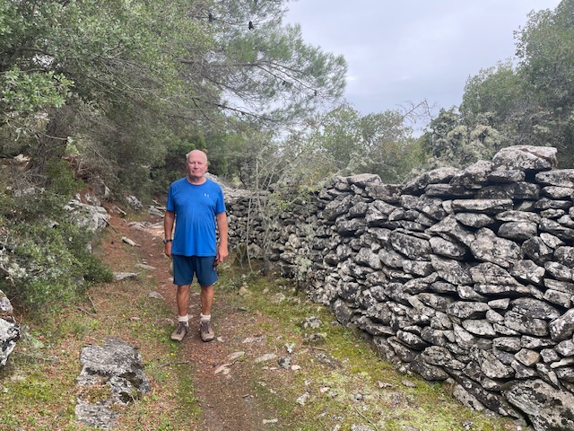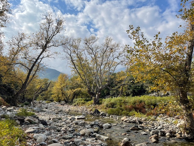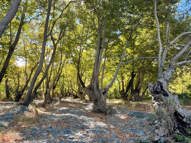 Als es wieder sonniger und wärmer wird, ziehen wir unsere Wanderschuhe an, fahren mit dem Bus in das Bergdorf Theológos und laufen am Bachbett des Dipótamos entlang hinunter bis zur Küste. Auf einem sehr gut markierten Pfad geht es fast elf Kilometer durch abwechslungsreiches Gelände, mal an Steinmäuerchen entlang durch Olivenhaine, dann durch Eichen- und Platanenwälder und durch Kiefern und Heidekraut. In Deutschland würde man einen so gut angelegten, wunderschönen Weg als „Premium-Wanderweg“ einstufen. Außer Ziegen und Schafen haben wir hier niemanden getroffen.