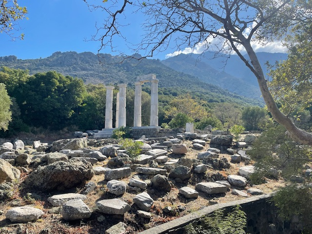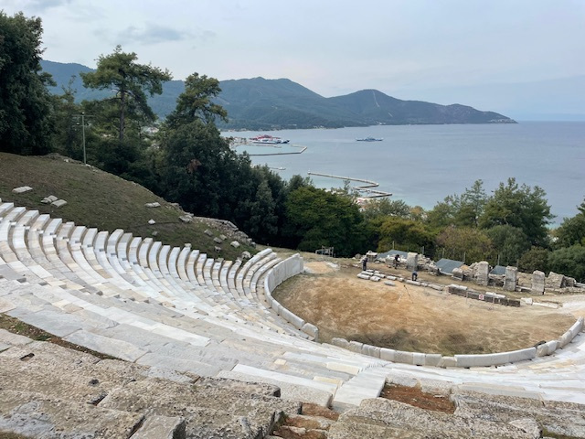 Mit dem lokalen Bus fahren wir für einen Tag auf die Nordseite nach Liménia/Thassos. Hier herrscht reger Fährverkehr zum Festland nach Keramoti. Im alten Kriegshafen, in dem heute die Fischerboote liegen, lassen wir uns das vom Bäcker mitgebrachte Frühstück schmecken (Spinattasche und Tomatenkäsetasche). Direkt in der Stadt gibt es viele Überreste aus der Antike zu entdecken. Und oben im Wald über der Stadt bestaunen wir das Amphitheater, ganz aus weißem Marmor, das gerade restauriert wird.