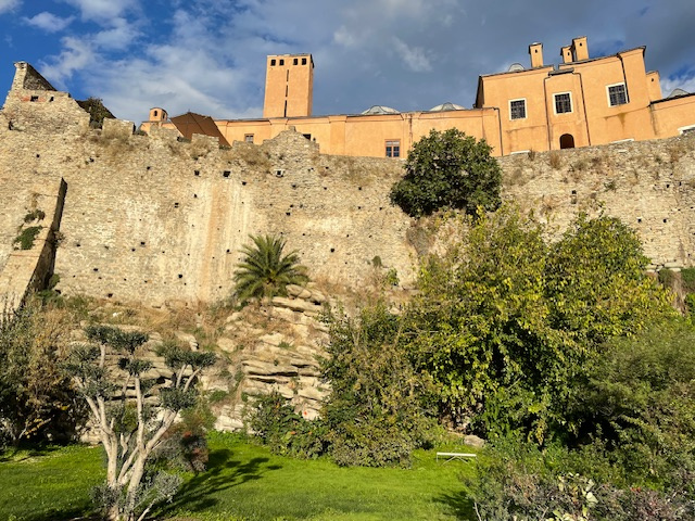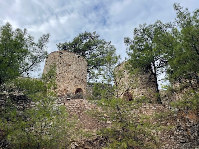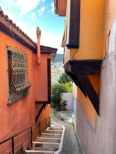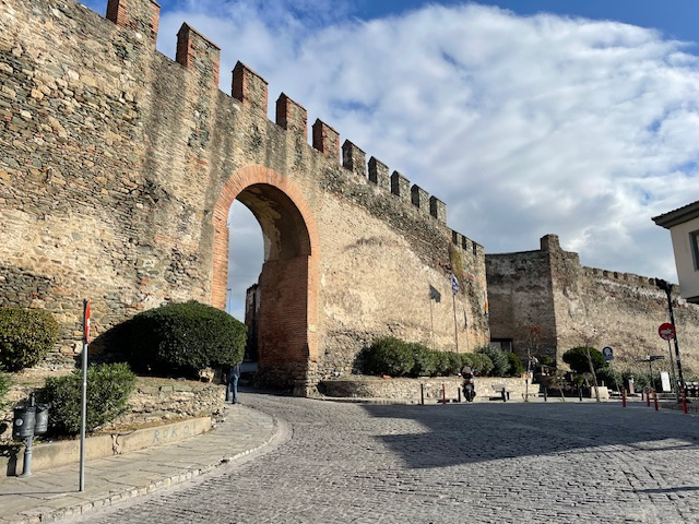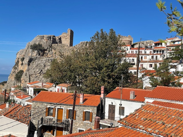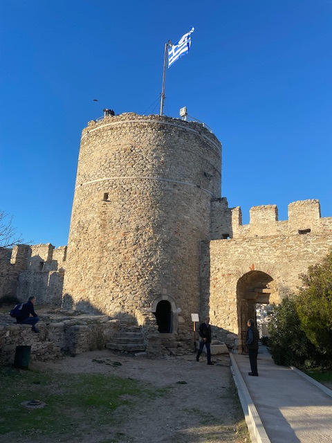 Und dann der etwas sportlichere Teil des Tages: Aufstieg in die Oberstadt zu den dicht gedrängten kleinen Häusern mit den roten Ziegeldächern, zur Stadtmauer und zum Kastell. Der Blick hinunter auf die Stadt, den Hafen und den Golf ist grandios. Die Sonne ist endlich wieder da, aber der Olymp, den man von hier bei klarem Wetter sehen kann, hüllt sich in Wolken.