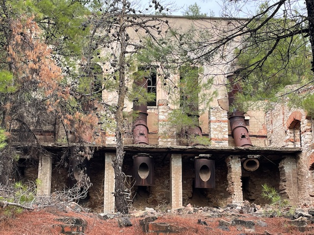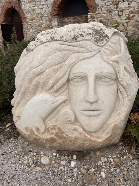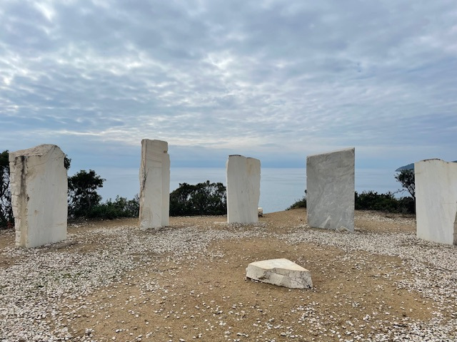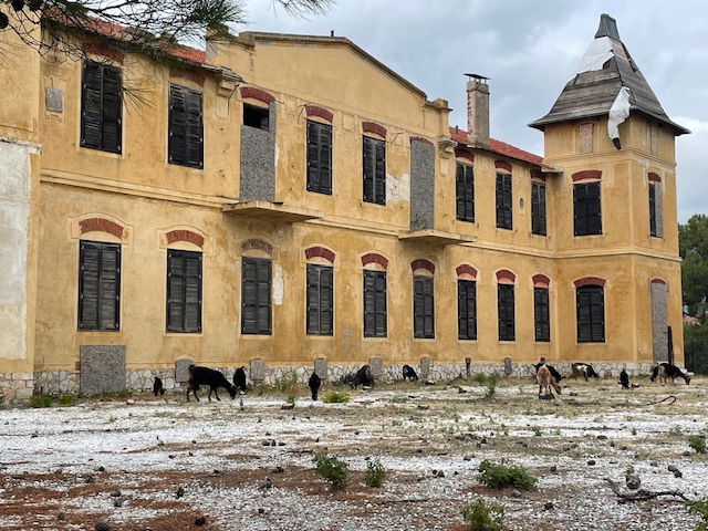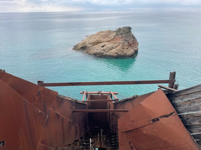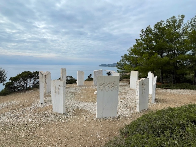 Limenária ist eine alte Bergbaustadt. Die ersten offiziellen Rechte für den Abbau von eisen-, zink-, blei- und silberhaltigem Gestein wurden 1903 an die Firma Speidel aus Pforzheim vergeben. Da stand die Insel noch unter türkischer Verwaltung. Das Speidelschlösschen, das seit 1964 nicht mehr bewohnt wird, thront direkt über dem Hafen. Leider wird es nicht instand gehalten. Die alten Anlagen aus der Bergwerkszeit haben wir uns natürlich angeschaut und auch die „Krone von Limenária“, zwölf zu einem Kreis angeordnete Marmortafeln, die von Schülern der Stuttgarter Waldorfschule gestaltet wurden.