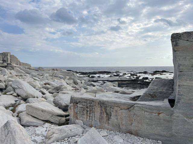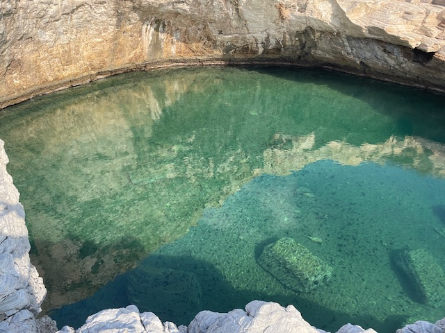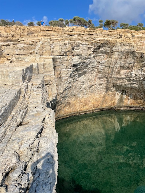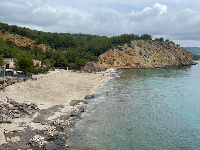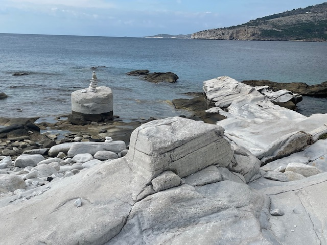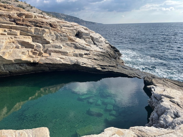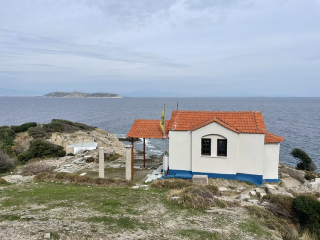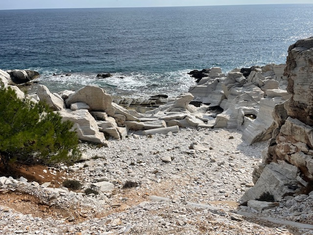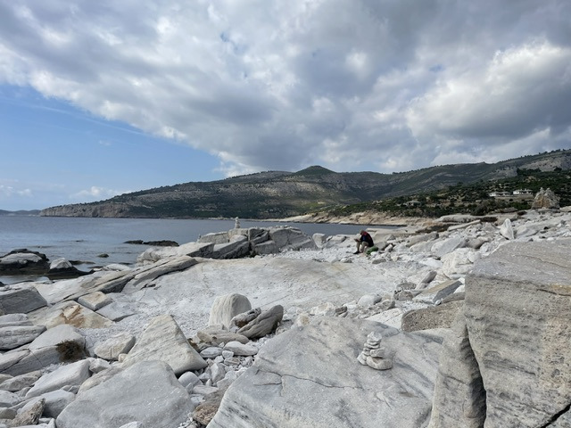 Das Wetter ist weiterhin sehr unbeständig, kühl, viele Wolken und ab und zu Regen. Das hält uns aber nicht davon ab, die Insel weiter zu erkunden. So fahren wir mit einem Leihwagen einen Tag lang die Südküste entlang, steigen die steilen Felsen zu einem besonderen Badeplatz (Gióla) zwischen den Klippen hinunter. Entlang der schroffen Marmorküste und schönen Sandstränden geht es dann weiter vorbei am Kloster Archangélou zur Halbinsel Alikí. Wir umrunden sie zu Fuß und bewundern die großen Marmorblöcke direkt am Meer und die Überreste der heiligen Stätten aus byzantinischer und römischer Zeit.