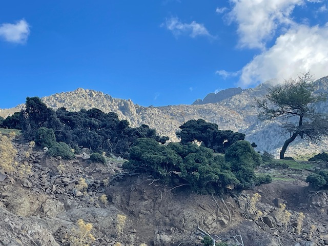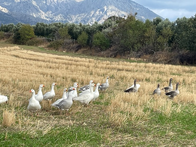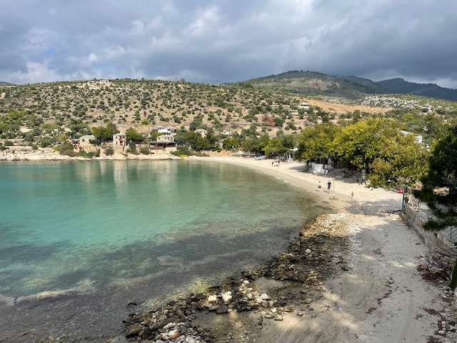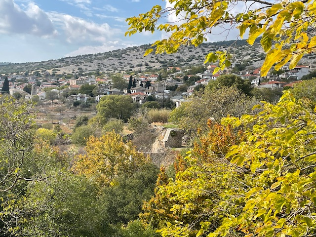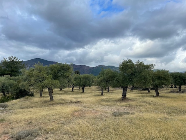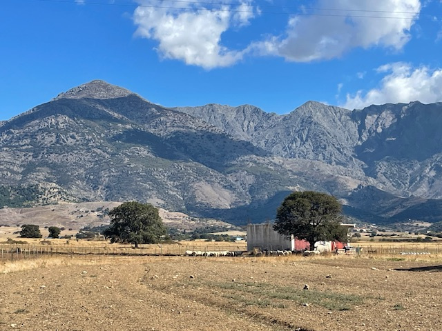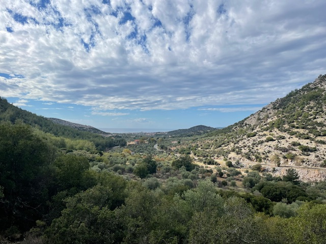 Der Südwesten der Insel ist ländlich. Mit Blick auf die hohen Berge sind wir hier durch abgemähte Felder gelaufen, vorbei an an kleinen Bauernhöfen mit Ziegen, Schafen und Gänsen und manchmal auch militärischen Einrichtungen. Die Türkei ist nicht weit.