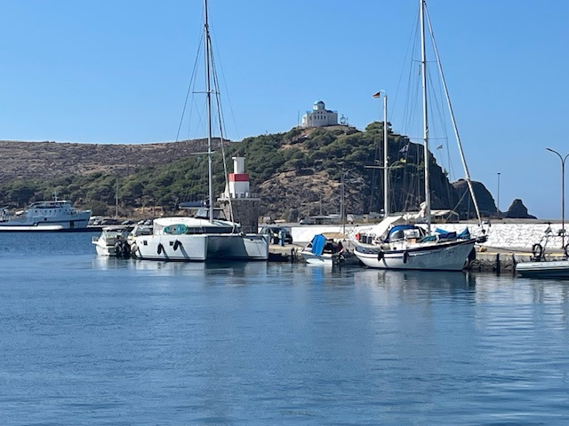 Entlang der Westseite machten wir für eine Nacht einen Stopp in Neós Marmarás. Beim Anlegen auf dem einzigen möglichen Platz mussten wir feststellen, dass der Schwimmsteg völlig marode, wackelig und zudem auch extrem niedrig war. Der Schwell stand fast ungehindert in den Hafen, da der schützende Wellenbrecher abgebaut worden war. Bei so viel Geschaukel trauten wir uns nicht sehr nahe an den Schwimmsteg, konnten daher unsere Gangway nicht nutzen und an Land gehen. Kein Problem, das Abendessen hatten wir im Kühlschrank und der Blick auf den Ort war sehr schön. Nur der Sekt zu unserem 35. Hochzeitstag fehlte. Wider Erwarten hatten wir eine ruhige Nacht und konnten am nächsten Morgen gut ausgeruht beim Kaffee zuschauen, wie ein großes Fischerboot, das vor uns lag, hin- und her manövriert wurde.