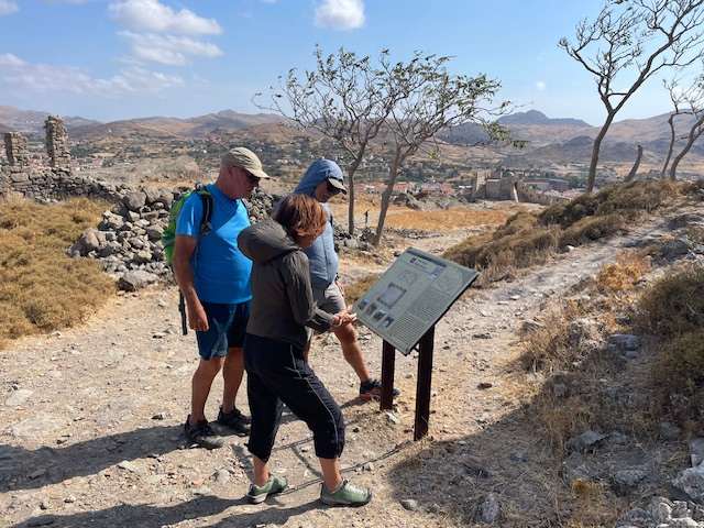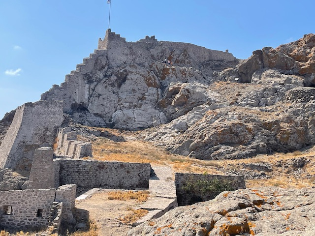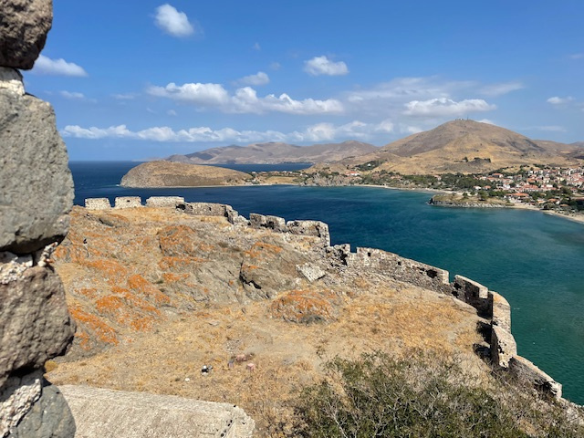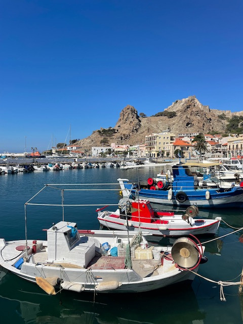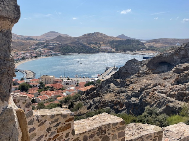 Im Hafen von Myrina konnten wir längsseits anlegen, mit einem tollen Blick auf die große Festung direkt über dem Hafen. Damit unser Besuch, der am nächsten Tag mit der Fähre von Chios kam, genügend Platz an Bord hatte, gab es eine größere Umräumaktion. Der Blick auf die Wetterapps zeigte uns, dass wir in den nächsten Tagen wahrscheinlich kaum Gelegenheit zum Segeln haben würden, da sehr wechselhaftes Wetter mit viel Wind und Regen angekündigt war.