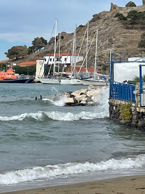 Nun liegen wir direkt vor dem Hotel Limnos und dem Rathaus, haben eine unruhige Nacht mit viel Regen und Wind hinter uns. Einmal mussten wir am frühen Morgen an Deck, um eine zweite Spring auszubringen. Der Wind hatte gedreht und war noch stärker geworden. Inzwischen hat sich im Hafen eine Dünung aufgebaut. Ziemlich ungemütlich. Alle Boote fahren hin und her und es ruckt an den Ankerketten und Leinen. Wir bleiben bei unserem Boot und warten darauf, dass es ruhiger wird. Und wir freuen uns schon auf die nächste Insel: Samothraki, 40 Seemeilen nördlich.