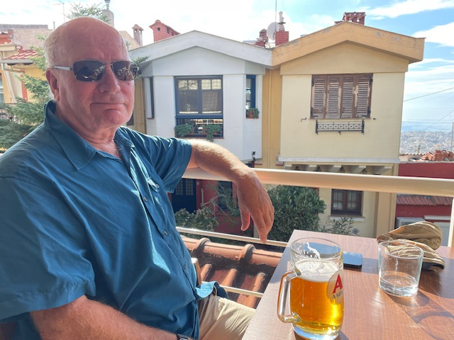 Gerade findet das Internationale Filmfestival Thessaloniki statt. Dadurch sind besonders viele Besucher in der Stadt. Viele Vorführungsorte sind im Gelände des alten Hafens. In den Speicherhäusern sind auch Museen untergebracht. Hier war unser Lieblingsplatz für ein Faßbier gegen Abend, mit Blick auf den Thermaischen Golf, auf dem wir ja auch gesegelt sind.