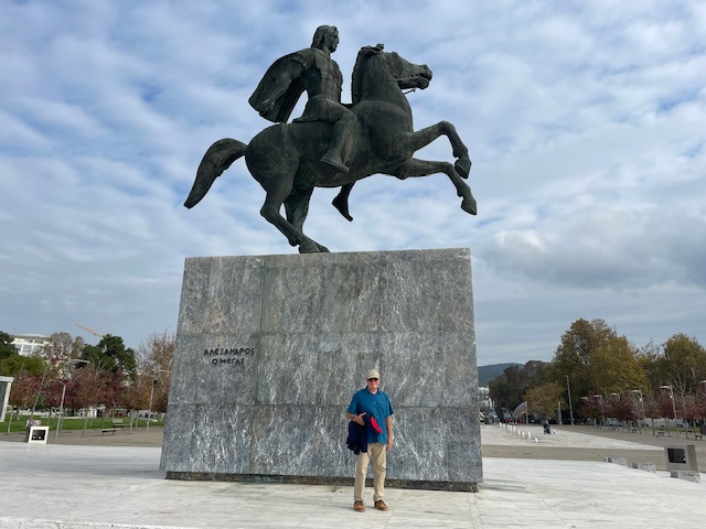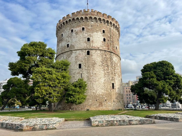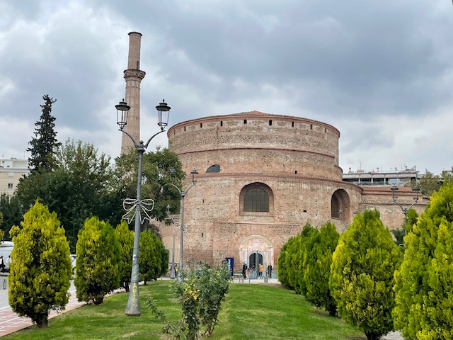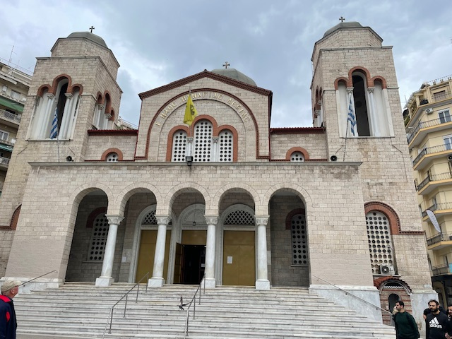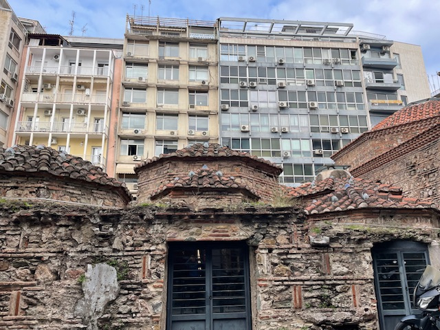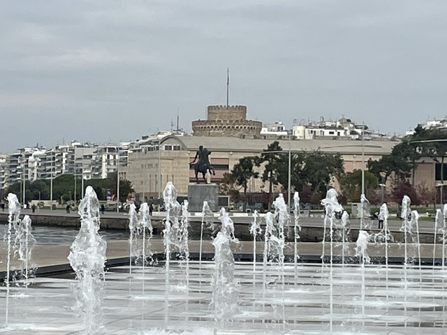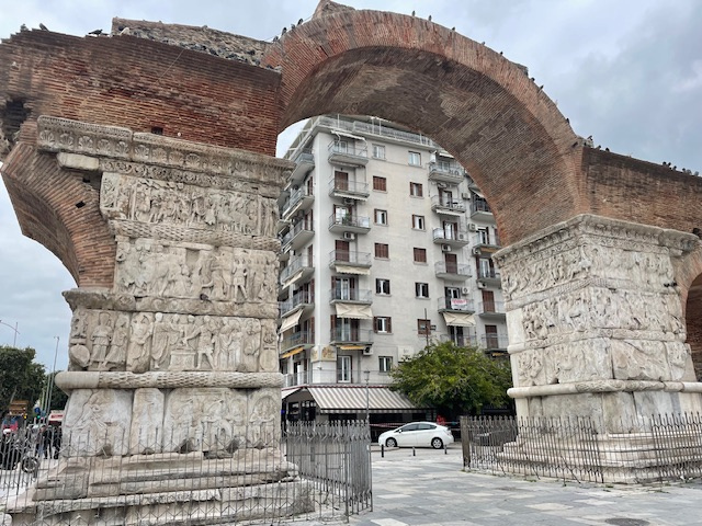 Erst mal haben wir uns mit einer Stadtrundfahrt einen Überblick verschafft, dann zu Fuß viele der Sehenswürdigkeiten besucht: die lange Hafenpromenade bis zu dem Weißen Turm, zur Statue von Alexander dem Großen und zu den Umbrellas. In der Stadt stößt man in kurzen Abständen immer wieder auf Kirchen, groß und klein, jede mit ihrem eigenen Heiligen und ihrer eigenen Geschichte. Die bekannteste ist die große Agia Sofia. Fasziniert hat uns, dass sie alle mitten zwischen den eng stehenden Hochhäusern stehen. Auch die Überreste der römischen Bauten sind mitten in der Stadt nicht zu übersehen. Besonders markant sind der Galeriusbogen und die Rotonde des Galerius. Das Bey Hamam konnten wir leider nur von außen anschauen, denn es ist baufällig und daher geschlossen. Schade! Ein großer Teil der Stadt wurde bei einem großen Brand 1917 zerstört und ein Erdbeben 1978 richtete viele Schäden an.