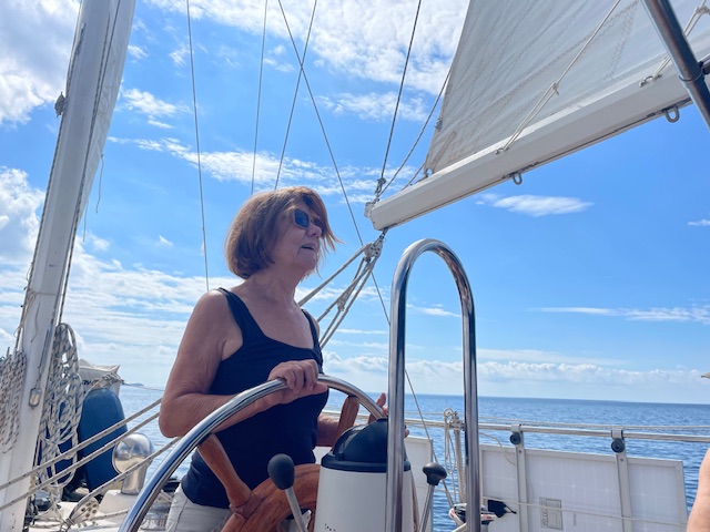 Gleich danach, an 1. September, konnten wir zu dritt lossegeln, bei leichtem Wind und sonnigem wolkenlosem Wetter. Sogar am Olymp, den wir immer vor Augen hatten, war in den drei Tagen, die wir zusammen unterwegs waren, keine Wolke zu sehen. Das hat man nicht so oft. Schön, direkt nach dem Start wieder mit Groß, Genua und Besan unterwegs zu sein.