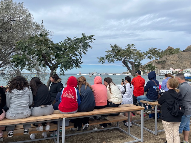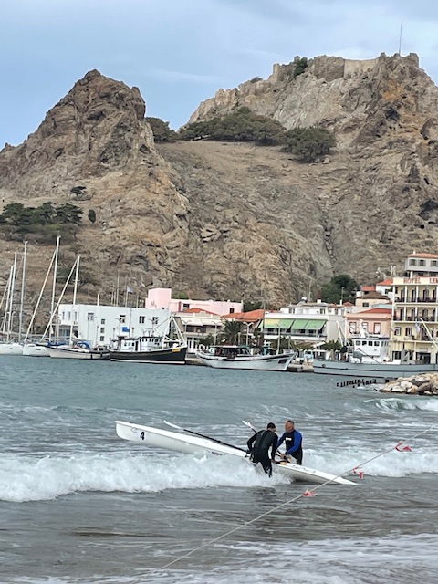 Das Kreuzfahrtschiff kam heute morgen übrigens tatsächlich, ankerte eine Weile außerhalb des Hafens. Die Passagiere, für die sicher eine Inselrundfahrt geplant war, wurden aber wegen des starken Windes und Wellengangs nicht an Land gebracht. Stattdessen konnten wir einen Wettbewerb des Hellas Rowing Team am Stadtstrand beobachten. Die Sportler ließen sich vom starken Wellengang nicht abschrecken.