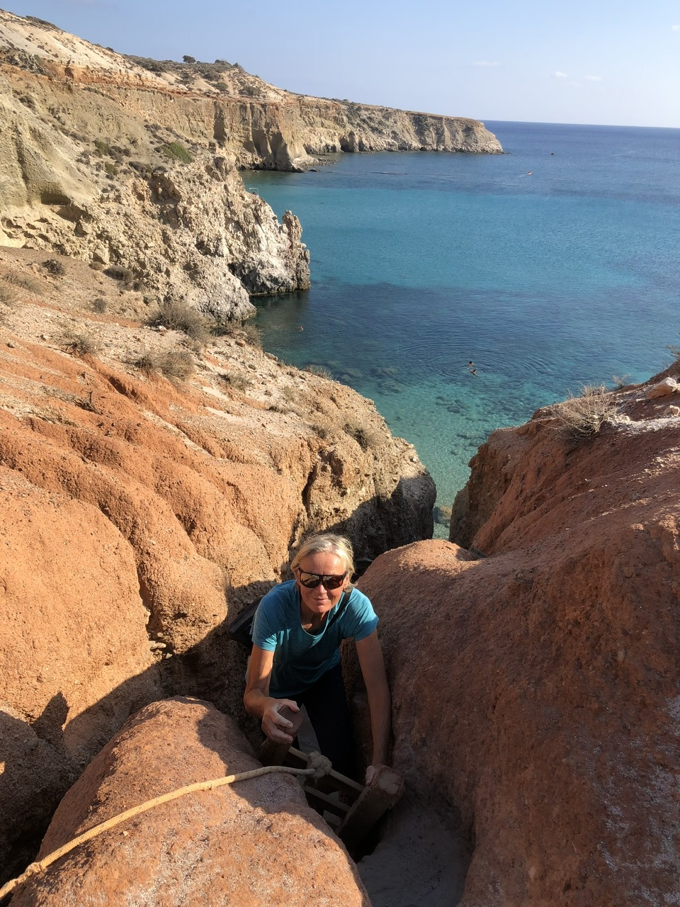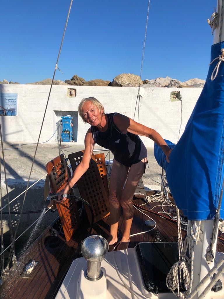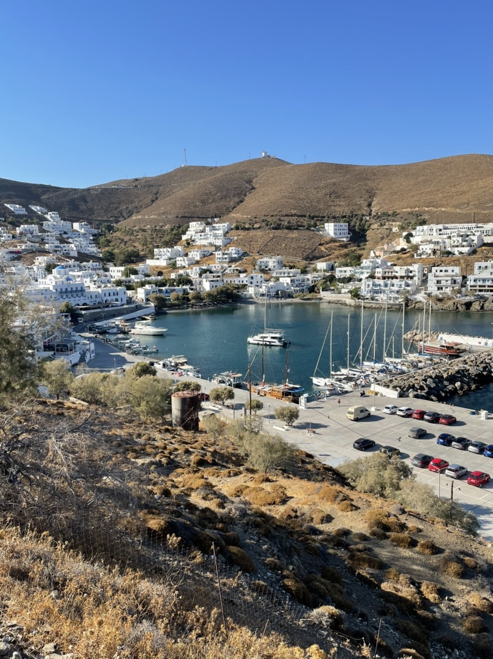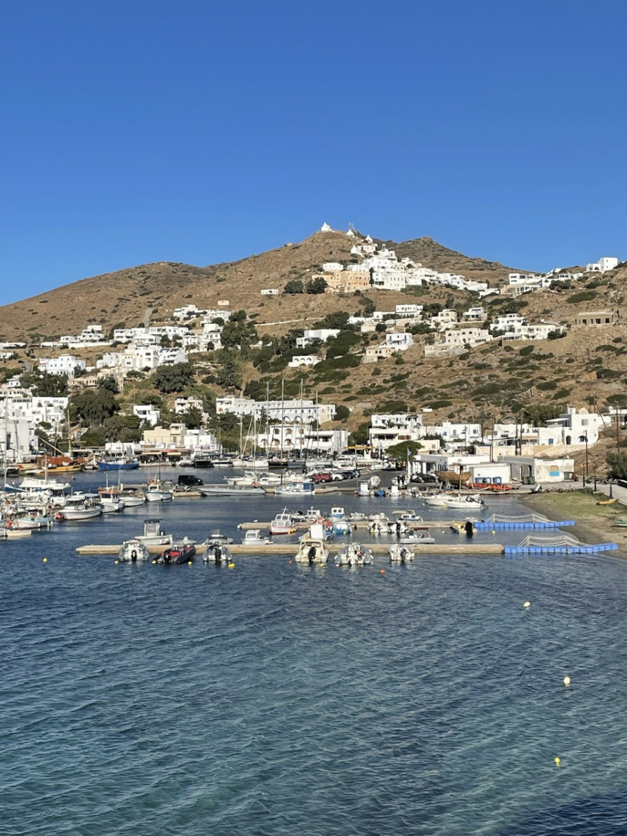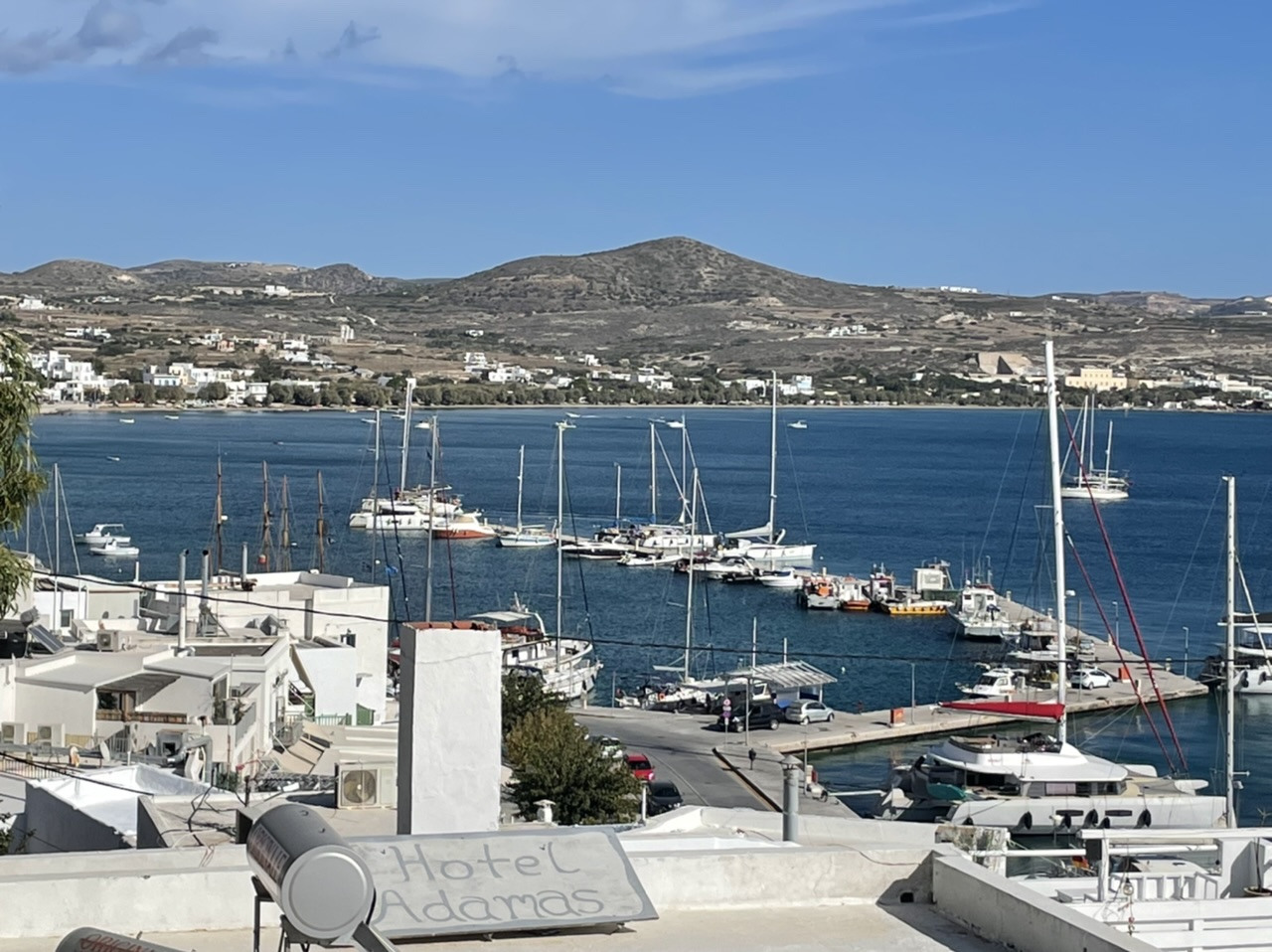 Auf Milos wollten wir uns ja Zeit lassen, um diese interessante Insel zu erkunden. Wir blieben etwas länger als geplant, da uns der tagelange Meltemi festhielt. Sehr komfortabel war es im Hafen von Adamas am Schwimmsteg nicht. Wir lagen zwar sicher bei dem starken bis zu 40 Knoten starken Nordwind (bei Südwind muss man dort sofort weg), aber unser Boot schaukelte sehr stark, der Wind stand uns direkt ins Cockpit und wir hatten je nach Böe Schwierikeiten, über unsere Passarelle von Bord und an Bord zu kommen. Aber wir sind ja klettererfahren. Die Fähren fuhren nicht. Und wir konnten beobachten, wie sich manche Boote an einen vermeintlich besseren Platz verlegten. Einer legte sich mit dem Bug zur Pier mit 7 Meter Abstand, Heckanker und sechs Leinen zur Pier. Sah aus wie ein Spinnennetz. Dafür nahm er drei Liegeplätze in Anspruch.