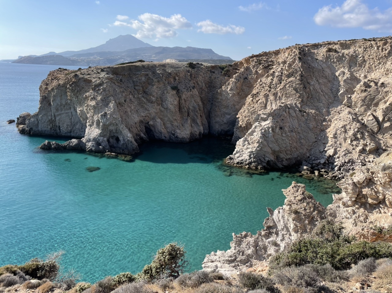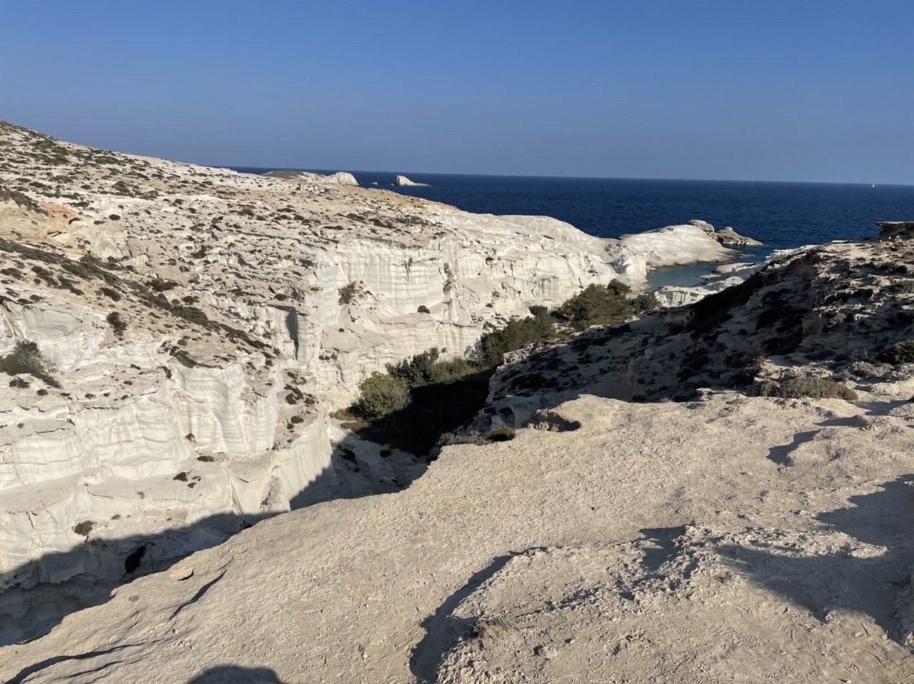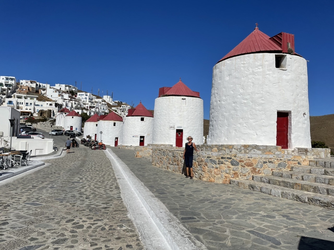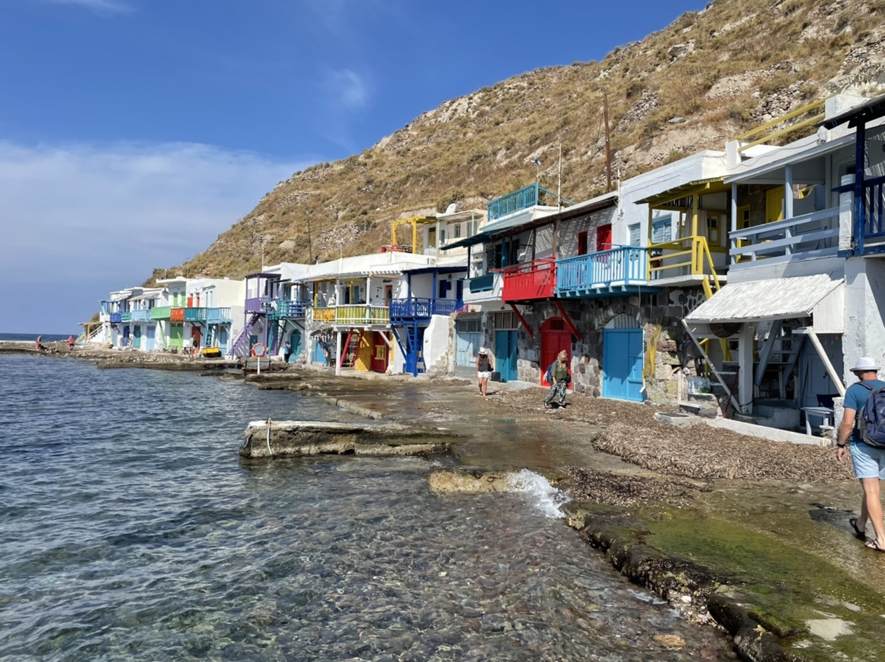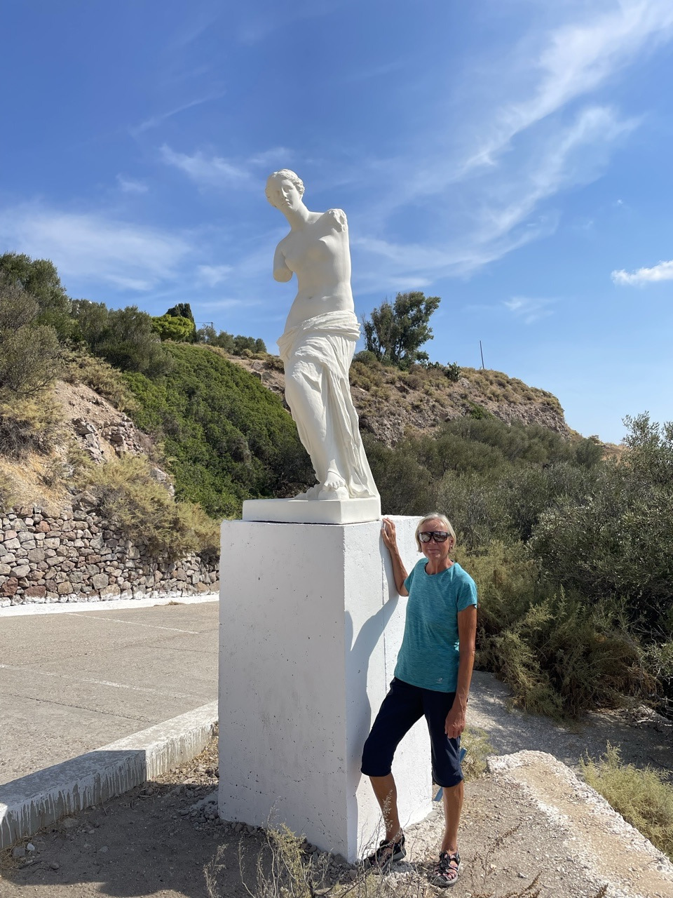 Auf Milos wollten wir uns ja Zeit lassen, um diese interessante Insel zu erkunden. Wir blieben etwas länger als geplant, da uns der tagelange Meltemi festhielt. Sehr komfortabel war es im Hafen von Adamas am Schwimmsteg nicht. Wir lagen zwar sicher bei dem starken bis zu 40 Knoten starken Nordwind (bei Südwind muss man dort sofort weg), aber unser Boot schaukelte sehr stark, der Wind stand uns direkt ins Cockpit und wir hatten je nach Böe Schwierikeiten, über unsere Passarelle von Bord und an Bord zu kommen. Aber wir sind ja klettererfahren. Die Fähren fuhren nicht. Und wir konnten beobachten, wie sich manche Boote an einen vermeintlich besseren Platz verlegten. Einer legte sich mit dem Bug zur Pier mit 7 Meter Abstand, Heckanker und sechs Leinen zur Pier. Sah aus wie ein Spinnennetz. Dafür nahm er drei Liegeplätze in Anspruch.