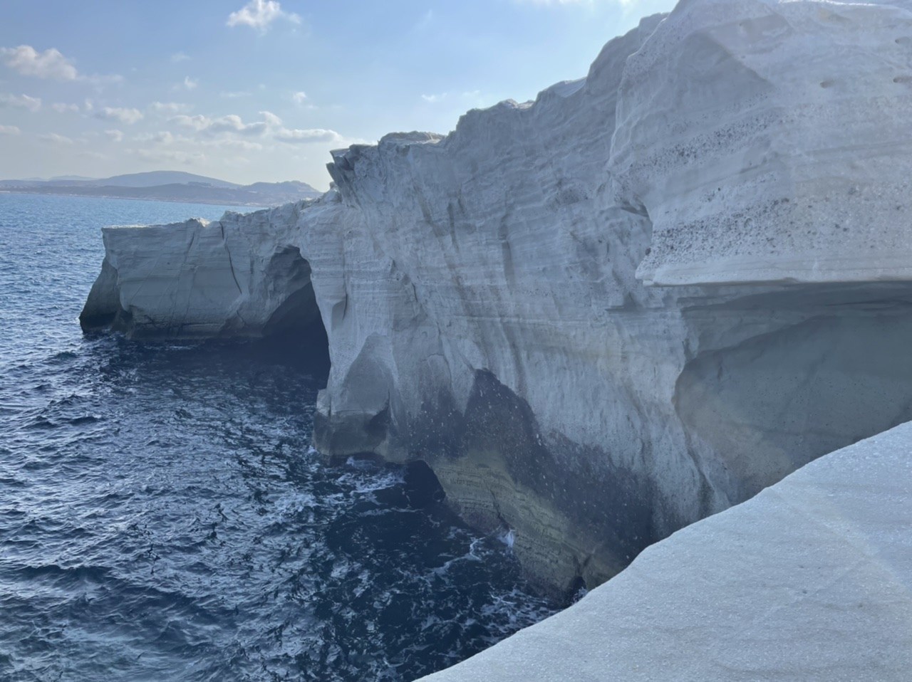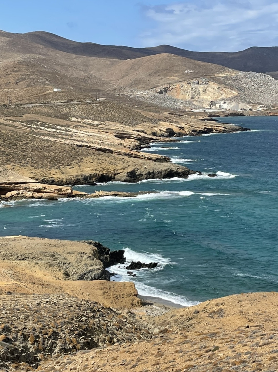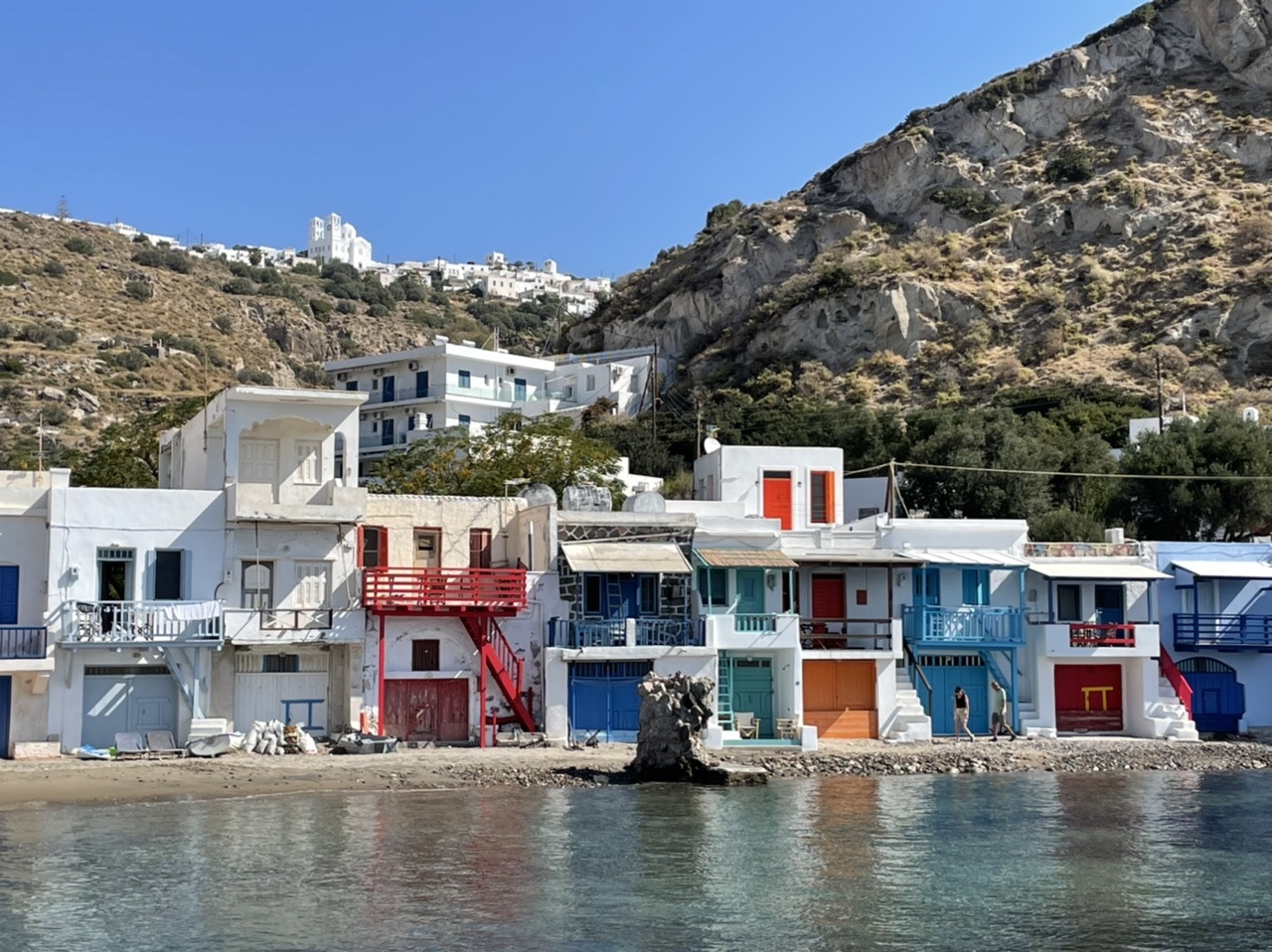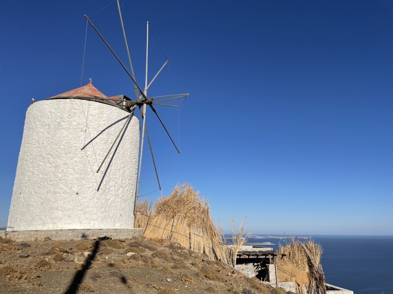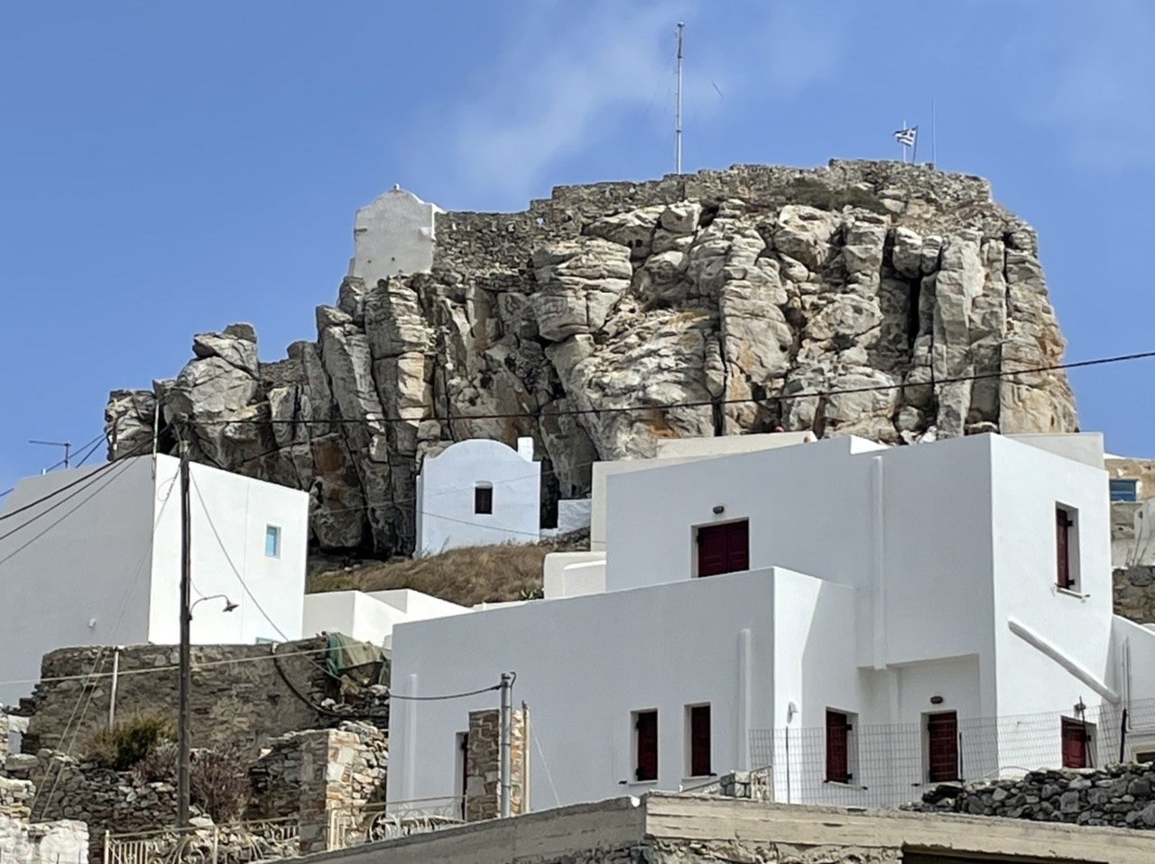 Auf Milos wollten wir uns ja Zeit lassen, um diese interessante Insel zu erkunden. Wir blieben etwas länger als geplant, da uns der tagelange Meltemi festhielt. Sehr komfortabel war es im Hafen von Adamas am Schwimmsteg nicht. Wir lagen zwar sicher bei dem starken bis zu 40 Knoten starken Nordwind (bei Südwind muss man dort sofort weg), aber unser Boot schaukelte sehr stark, der Wind stand uns direkt ins Cockpit und wir hatten je nach Böe Schwierikeiten, über unsere Passarelle von Bord und an Bord zu kommen. Aber wir sind ja klettererfahren. Die Fähren fuhren nicht. Und wir konnten beobachten, wie sich manche Boote an einen vermeintlich besseren Platz verlegten. Einer legte sich mit dem Bug zur Pier mit 7 Meter Abstand, Heckanker und sechs Leinen zur Pier. Sah aus wie ein Spinnennetz. Dafür nahm er drei Liegeplätze in Anspruch.