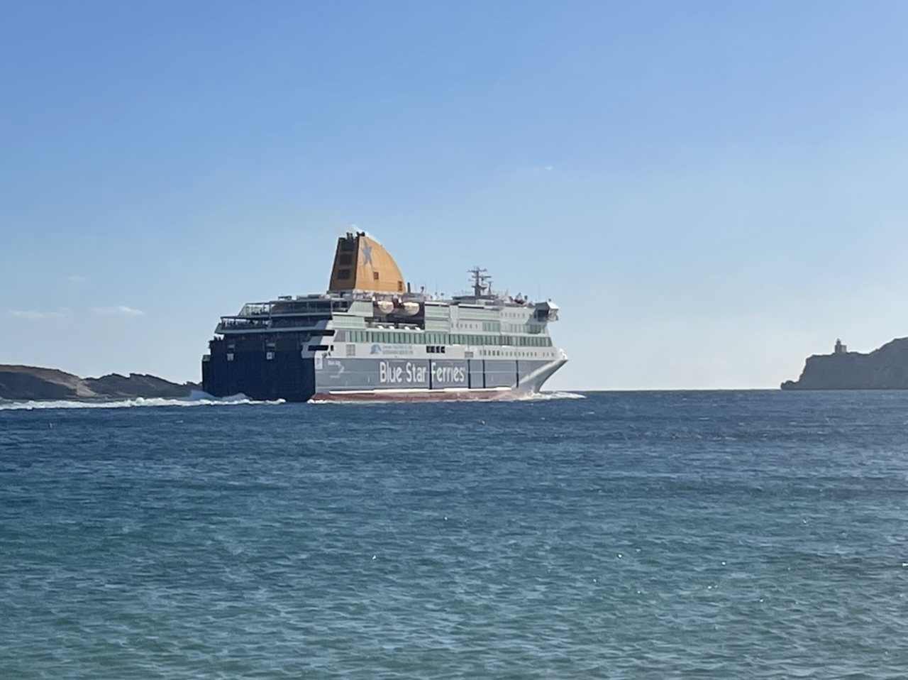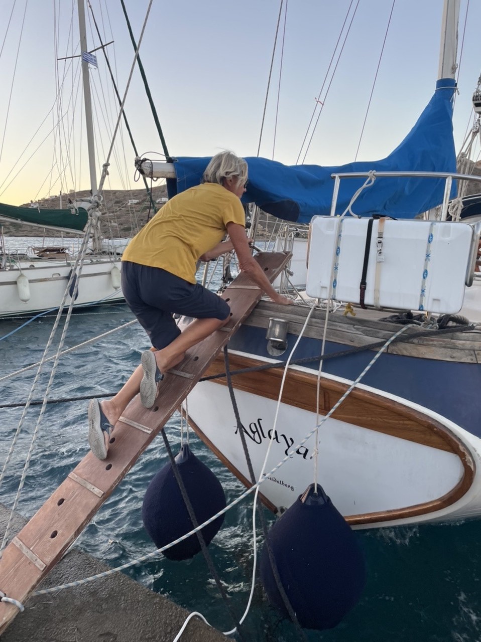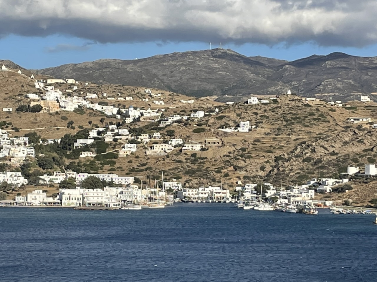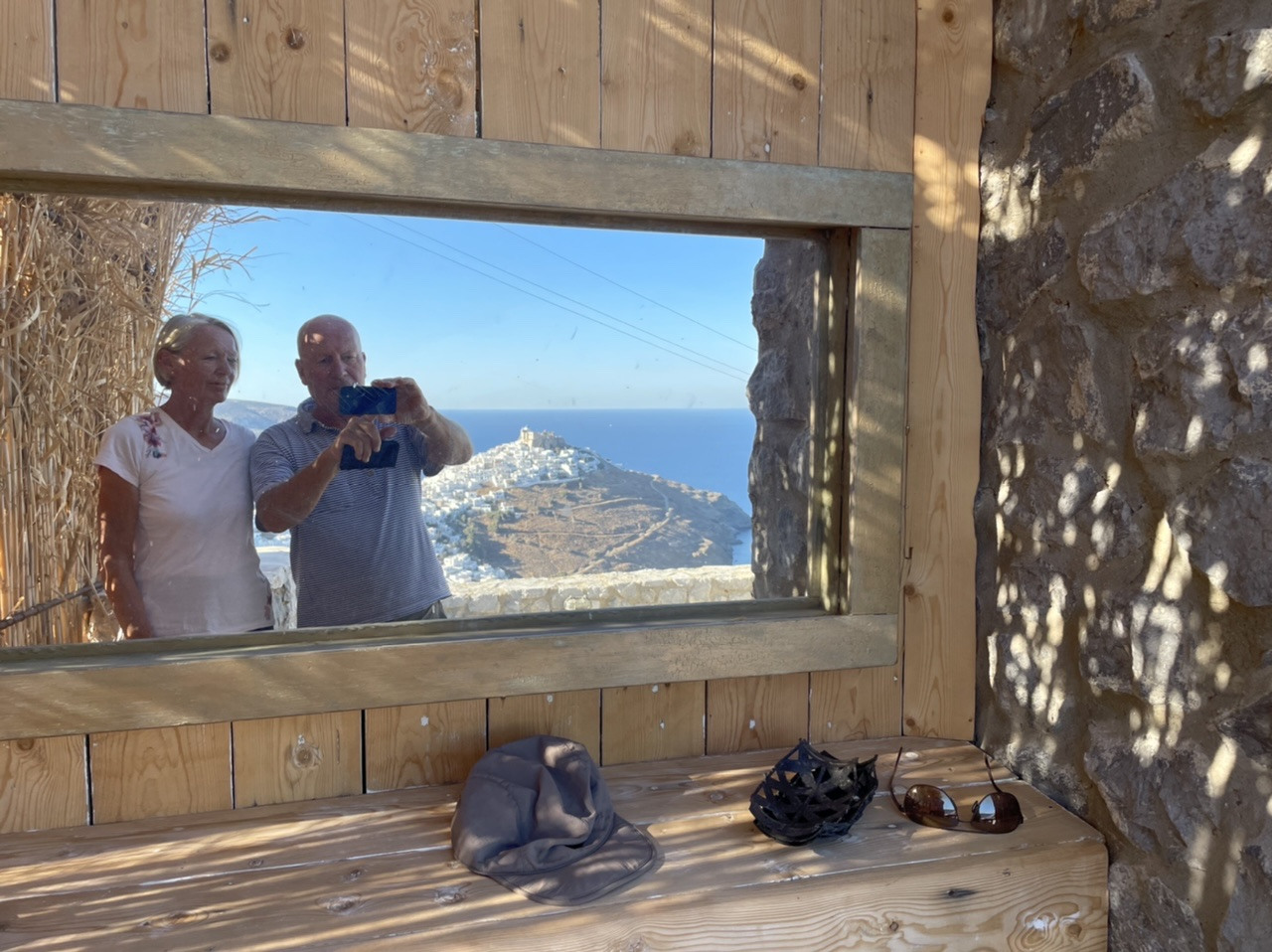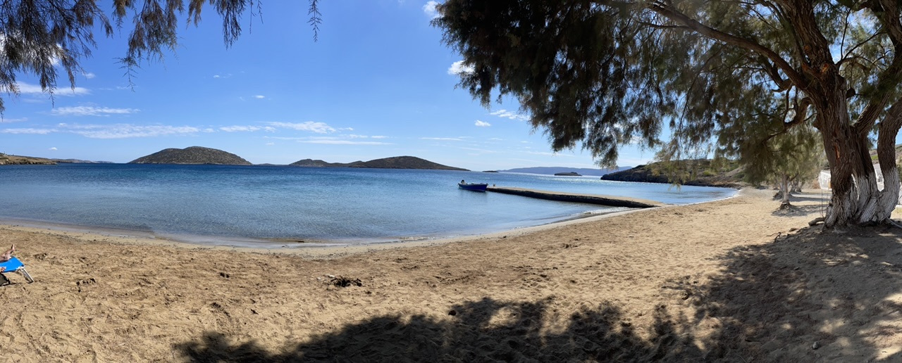 Auf Milos wollten wir uns ja Zeit lassen, um diese interessante Insel zu erkunden. Wir blieben etwas länger als geplant, da uns der tagelange Meltemi festhielt. Sehr komfortabel war es im Hafen von Adamas am Schwimmsteg nicht. Wir lagen zwar sicher bei dem starken bis zu 40 Knoten starken Nordwind (bei Südwind muss man dort sofort weg), aber unser Boot schaukelte sehr stark, der Wind stand uns direkt ins Cockpit und wir hatten je nach Böe Schwierikeiten, über unsere Passarelle von Bord und an Bord zu kommen. Aber wir sind ja klettererfahren. Die Fähren fuhren nicht. Und wir konnten beobachten, wie sich manche Boote an einen vermeintlich besseren Platz verlegten. Einer legte sich mit dem Bug zur Pier mit 7 Meter Abstand, Heckanker und sechs Leinen zur Pier. Sah aus wie ein Spinnennetz. Dafür nahm er drei Liegeplätze in Anspruch.