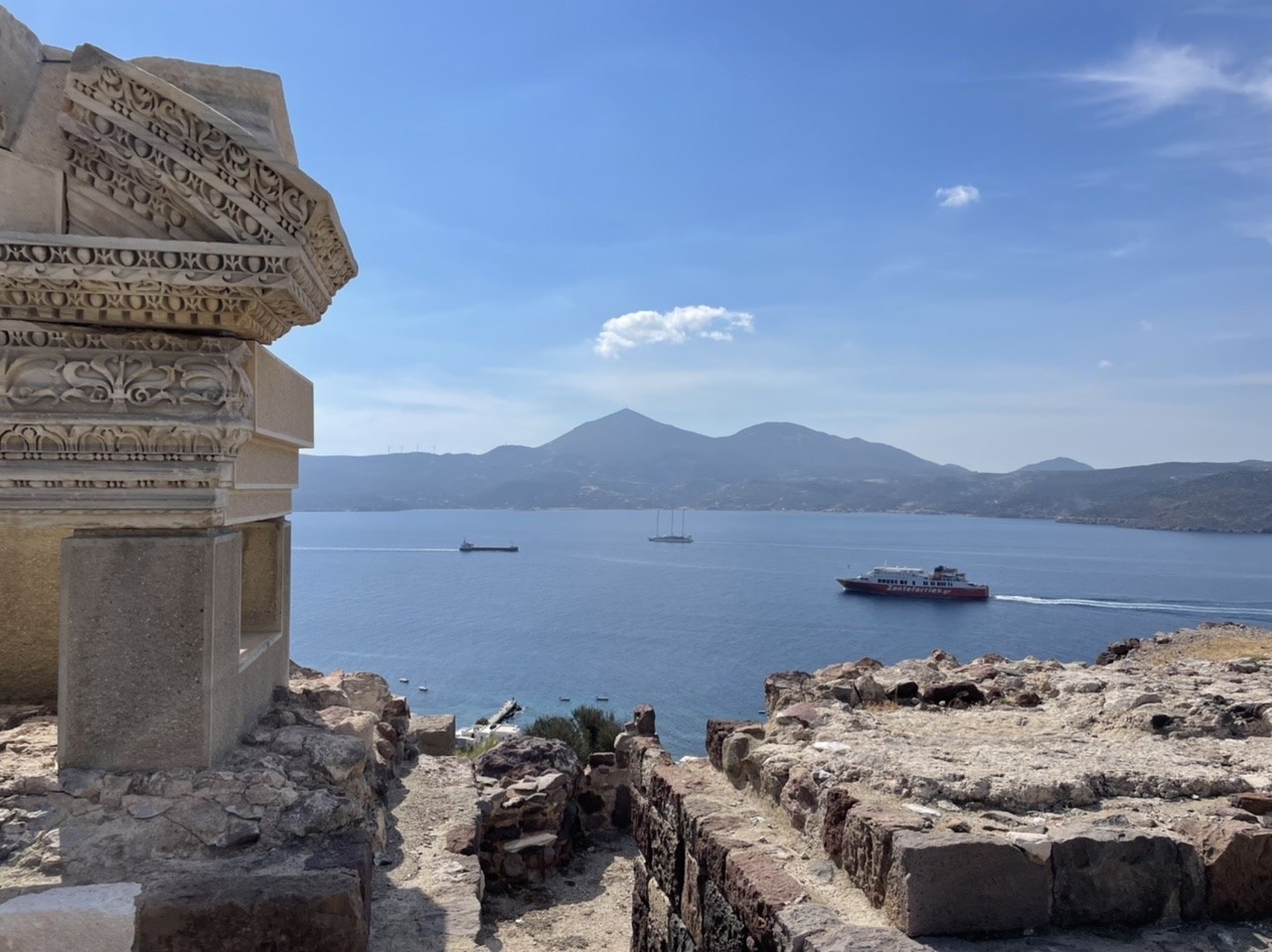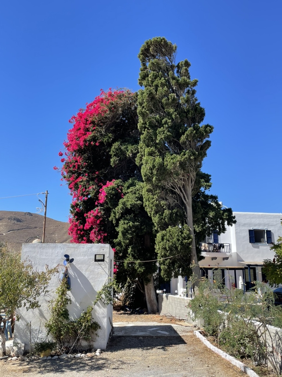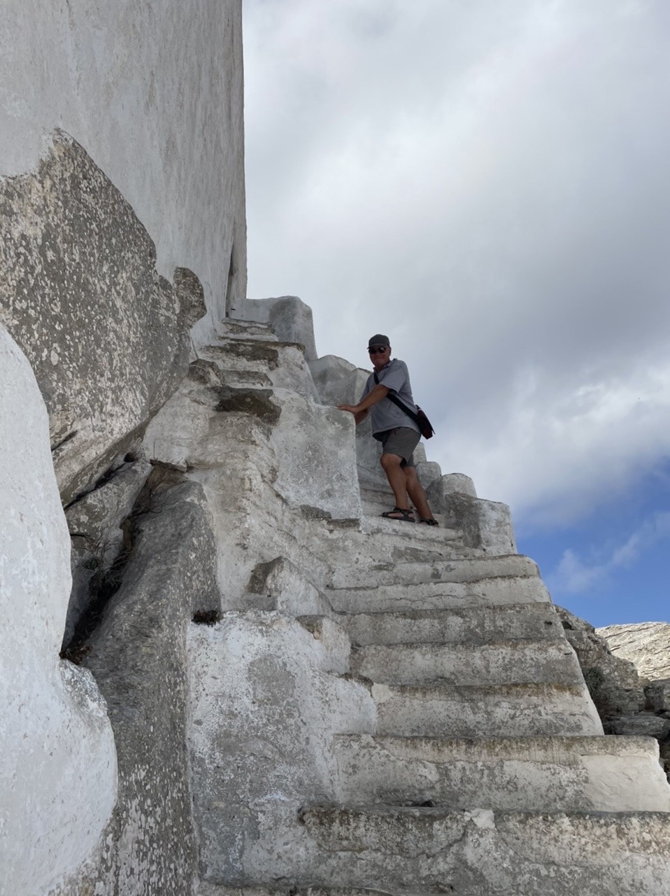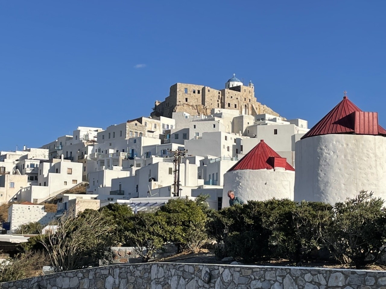 Auf Milos wollten wir uns ja Zeit lassen, um diese interessante Insel zu erkunden. Wir blieben etwas länger als geplant, da uns der tagelange Meltemi festhielt. Sehr komfortabel war es im Hafen von Adamas am Schwimmsteg nicht. Wir lagen zwar sicher bei dem starken bis zu 40 Knoten starken Nordwind (bei Südwind muss man dort sofort weg), aber unser Boot schaukelte sehr stark, der Wind stand uns direkt ins Cockpit und wir hatten je nach Böe Schwierikeiten, über unsere Passarelle von Bord und an Bord zu kommen. Aber wir sind ja klettererfahren. Die Fähren fuhren nicht. Und wir konnten beobachten, wie sich manche Boote an einen vermeintlich besseren Platz verlegten. Einer legte sich mit dem Bug zur Pier mit 7 Meter Abstand, Heckanker und sechs Leinen zur Pier. Sah aus wie ein Spinnennetz. Dafür nahm er drei Liegeplätze in Anspruch.