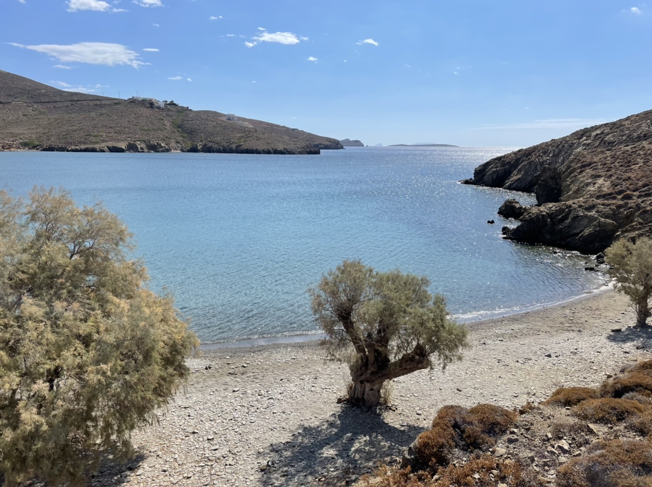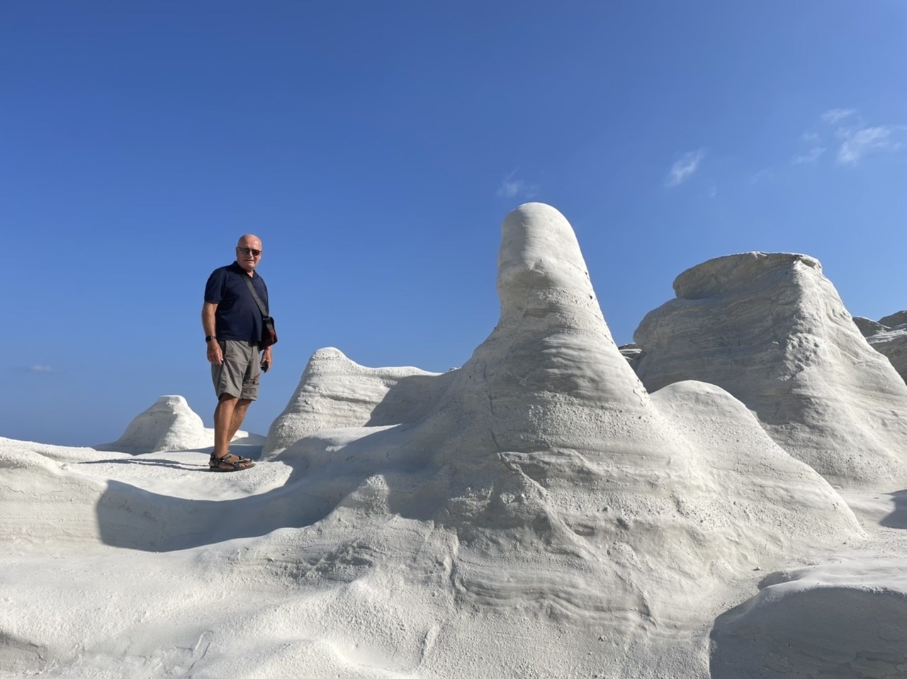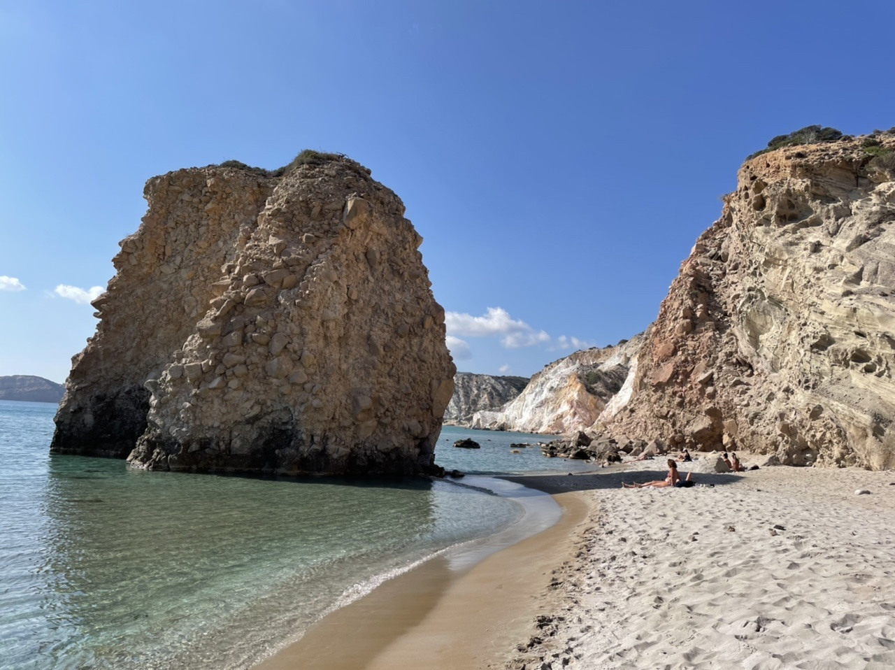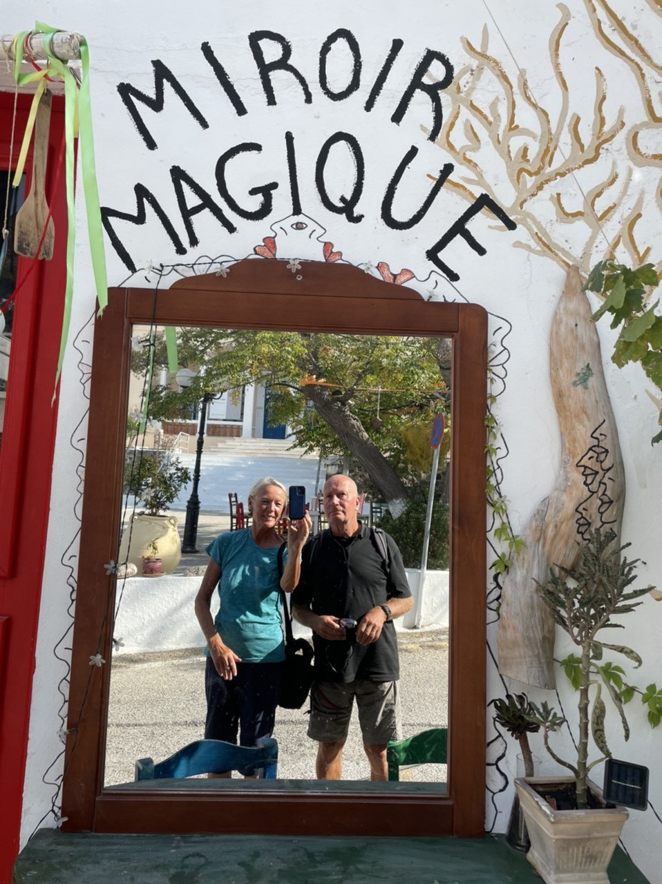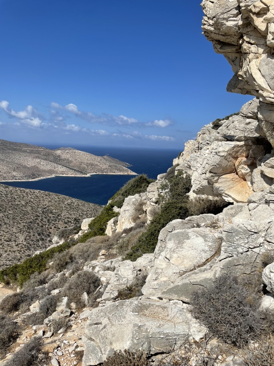 Auf Milos wollten wir uns ja Zeit lassen, um diese interessante Insel zu erkunden. Wir blieben etwas länger als geplant, da uns der tagelange Meltemi festhielt. Sehr komfortabel war es im Hafen von Adamas am Schwimmsteg nicht. Wir lagen zwar sicher bei dem starken bis zu 40 Knoten starken Nordwind (bei Südwind muss man dort sofort weg), aber unser Boot schaukelte sehr stark, der Wind stand uns direkt ins Cockpit und wir hatten je nach Böe Schwierikeiten, über unsere Passarelle von Bord und an Bord zu kommen. Aber wir sind ja klettererfahren. Die Fähren fuhren nicht. Und wir konnten beobachten, wie sich manche Boote an einen vermeintlich besseren Platz verlegten. Einer legte sich mit dem Bug zur Pier mit 7 Meter Abstand, Heckanker und sechs Leinen zur Pier. Sah aus wie ein Spinnennetz. Dafür nahm er drei Liegeplätze in Anspruch.