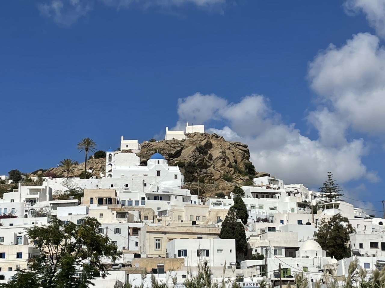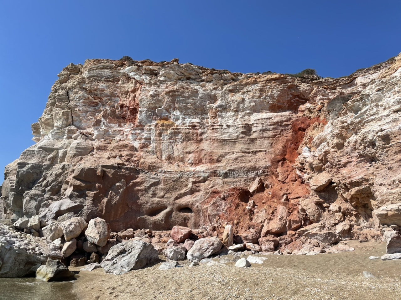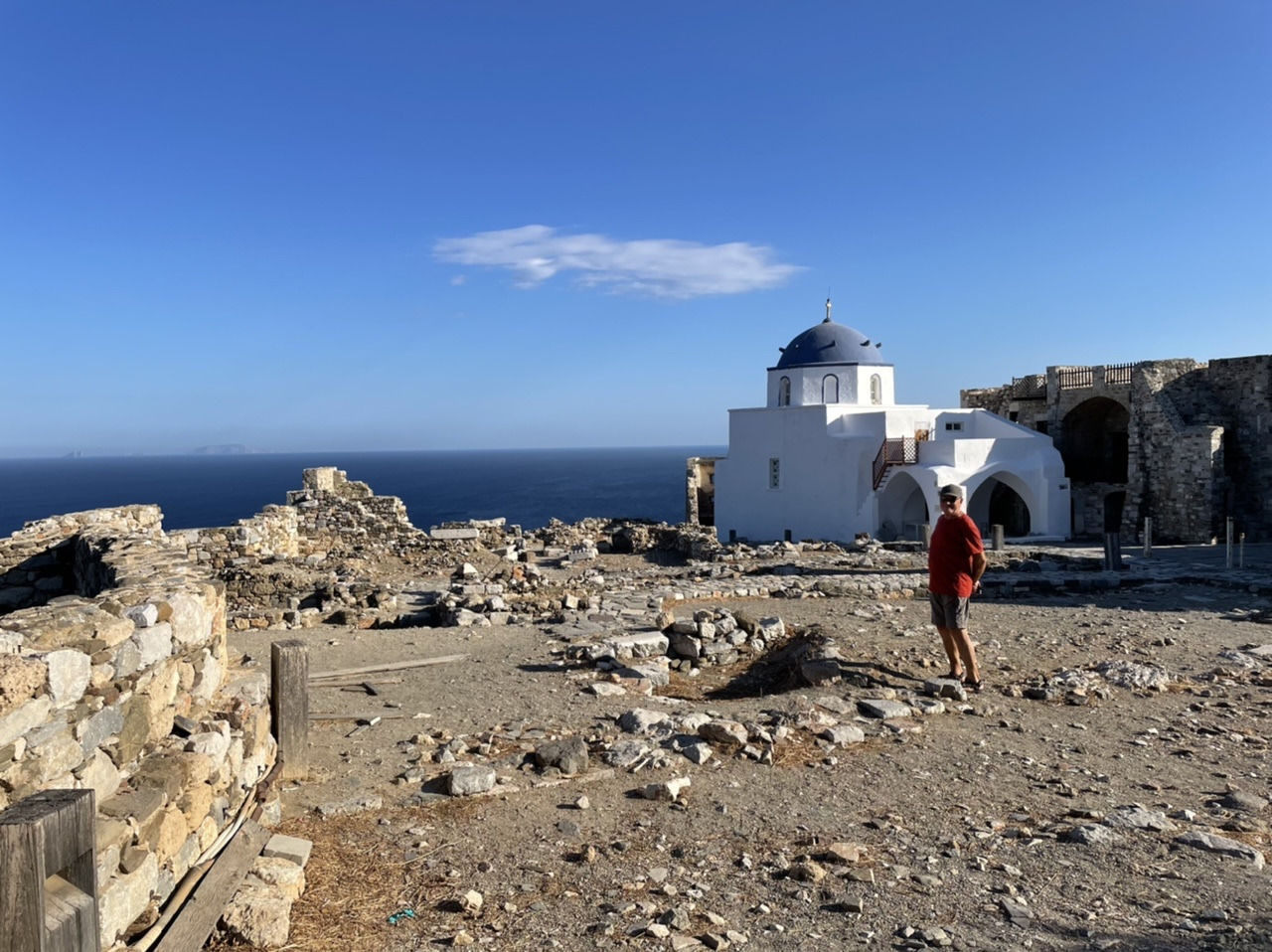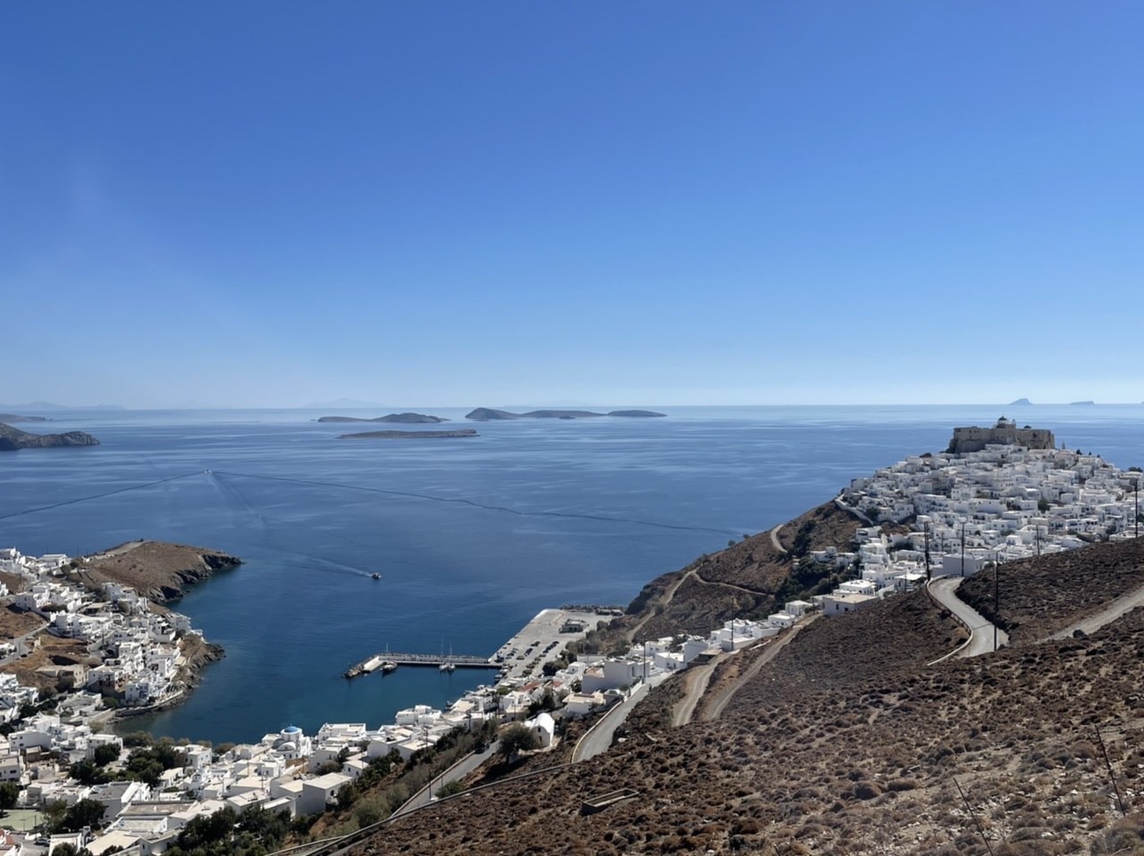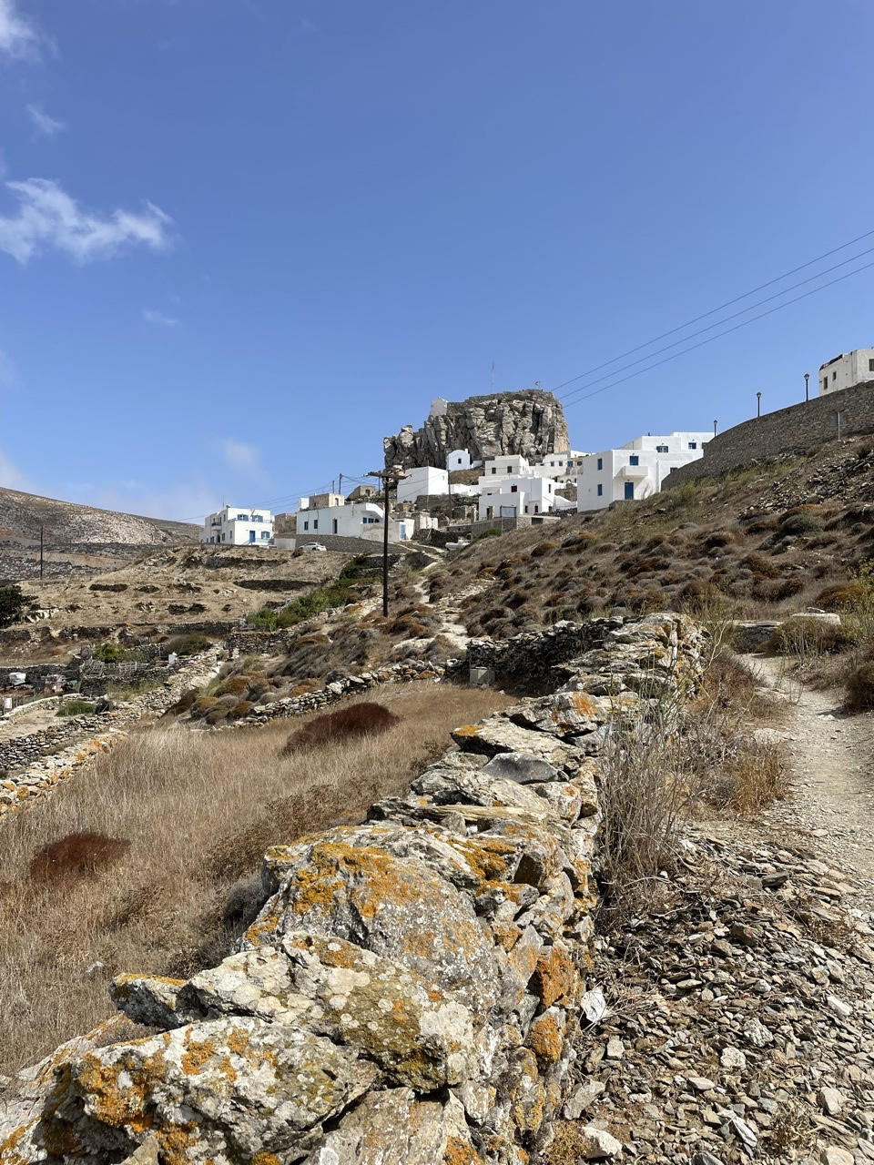 Auf Milos wollten wir uns ja Zeit lassen, um diese interessante Insel zu erkunden. Wir blieben etwas länger als geplant, da uns der tagelange Meltemi festhielt. Sehr komfortabel war es im Hafen von Adamas am Schwimmsteg nicht. Wir lagen zwar sicher bei dem starken bis zu 40 Knoten starken Nordwind (bei Südwind muss man dort sofort weg), aber unser Boot schaukelte sehr stark, der Wind stand uns direkt ins Cockpit und wir hatten je nach Böe Schwierikeiten, über unsere Passarelle von Bord und an Bord zu kommen. Aber wir sind ja klettererfahren. Die Fähren fuhren nicht. Und wir konnten beobachten, wie sich manche Boote an einen vermeintlich besseren Platz verlegten. Einer legte sich mit dem Bug zur Pier mit 7 Meter Abstand, Heckanker und sechs Leinen zur Pier. Sah aus wie ein Spinnennetz. Dafür nahm er drei Liegeplätze in Anspruch.