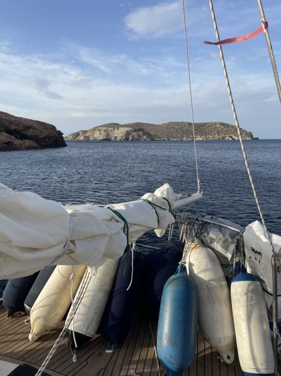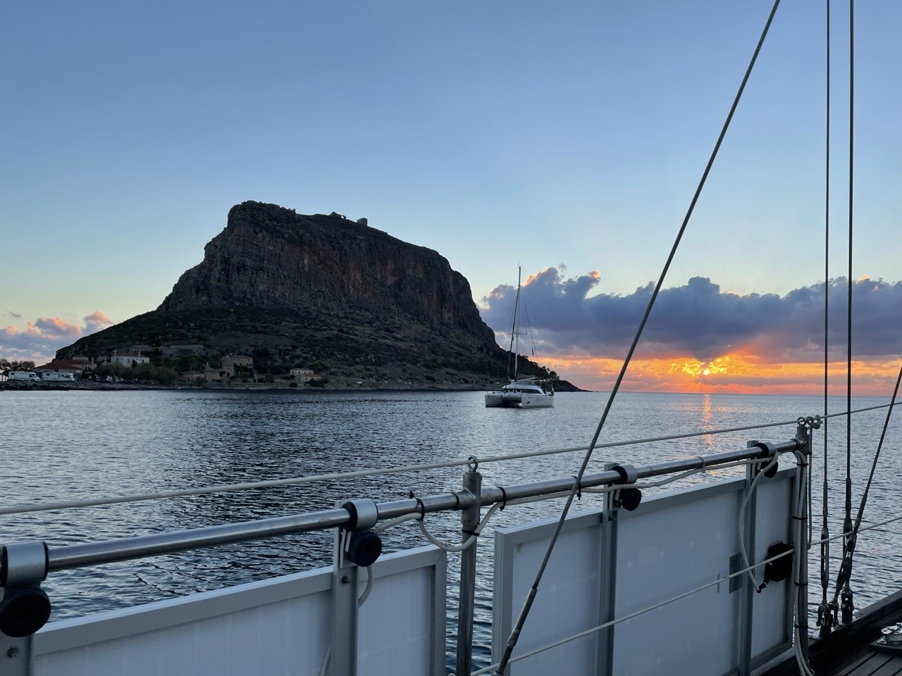 Ja und dann gab es ein kleines Zeitfenster ohne Starkwind. Von Mittwochnachmittag bis Donnerstagmittag. Das haben wir genutzt, haben einen großen Schlag gemacht, knapp 70 Seemeilen nach Westen, zum Peleponnes, nach Monemvasia. Am späten Nachmittag ging es los. Yassas Milos, du schöne, interessante und windumtoste Insel!