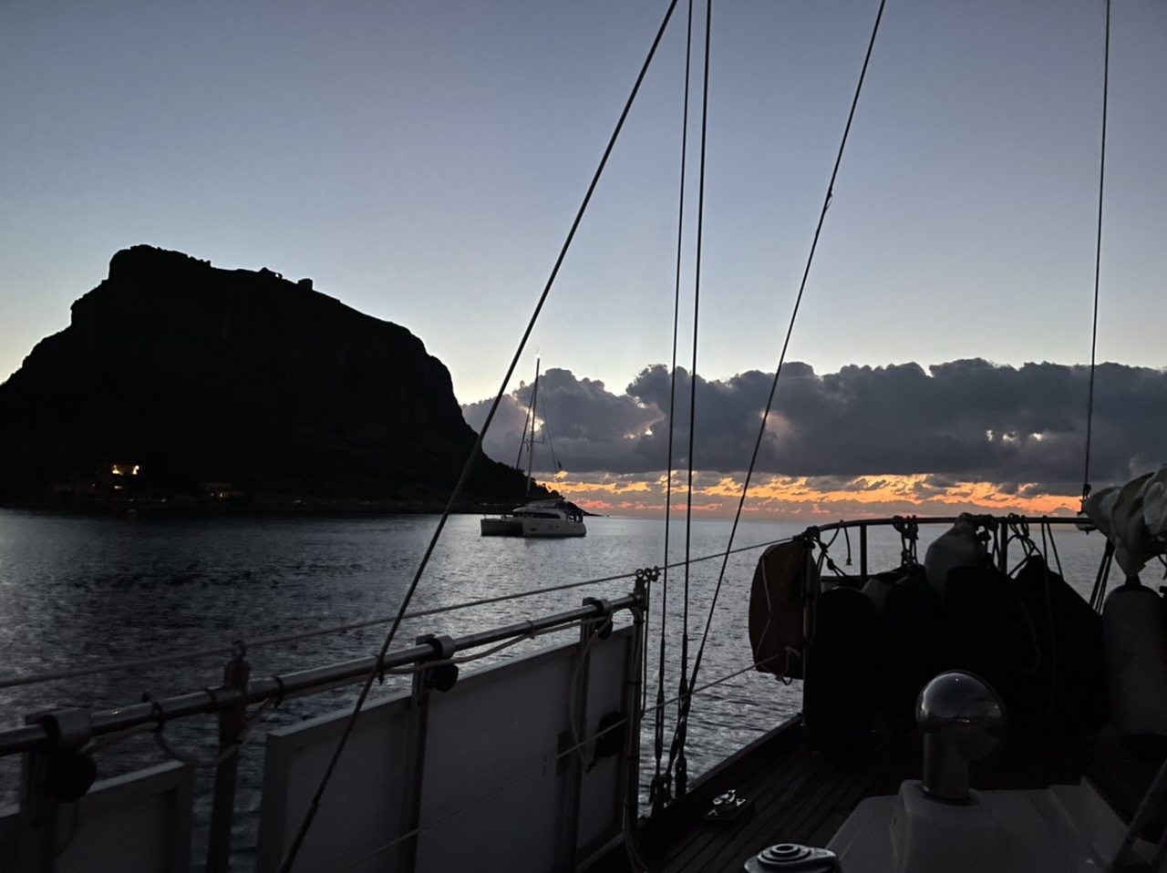 Es ist wie wir die Ägäis kennengelernt haben: entweder zu viel Wind oder zu wenig. Für unsere erste Nachtfahrt mit Aglaya: kein Wind! Also motoren, schade! Aber unser Nanni schnurrt vertrauenserweckend. Und bei Sonnenuntergang besuchen uns mehrere Delfine und machen schöne Sprünge, als wollten sie uns aus der Ägäis verabschieden. Mehrere Sternschnuppen während der Nacht (so spät im Jahr?), da können wir uns was wünschen. Und dann sind wir schneller als geplant. Da wir motoren, kommen um halb vier Uhr nachts in Monemvasia an, bei Dunkelheit. Das wollten wir eigentlich nicht. Also ankern wir vor dem Hafen. Wir kennen ihn zwar, aber dort wird immer noch am Ausbau mit einem Bagger gearbeitet. Und wer weiß, wie es gerade darin aussieht. Wir wissen, dass einige Felsen drin liegen. Wir ankern erst einmal vor dem Hafen. Da liegen schon zwei Boote, die haben die besten Plätze belegt. Es liegen viel Felsen auf dem Grund. Bei unseren ersten zwei Ankerversuchen holpert unser Anker darüber und beim Aufholen hoffen wir, dass er noch dran ist. Beim dritten Ankermanöver haben wir den richtigen Ankergrund erwischt. Er hält und wir können nach einem Bier zur Nacht um vier Uhr dreissig schlafen. Morgens verlegen wir uns dann in den Hafen. Der nächste Meltemi soll im Laufe des Tages kommen.