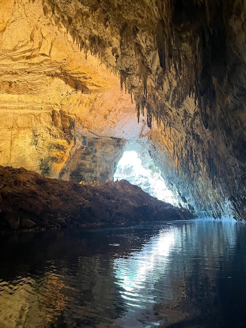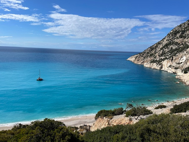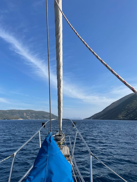 Mittlerweile sind wir vom Süden der Insel Lefkas Richtung Norden aufgebrochen. Weil die Brücke bei Lefkada außer Betrieb ist, bedeutete das, dass wir westlich außen um die Insel Lefkas Richtung Preveza segeln mussten, ein relativ großer Abschnitt ohne Buchten oder Häfen. Zunächst war auf unserem Weg nach Norden heftiger Nordwind vorhergesagt – also von vorn. Den wetterten wir erst einmal an der Ostseite von Lefkas in der mittlerweile uns wohlbekannten und wunderschönen Dhésimou-Bucht ab, vor Anker, sogar mit einigen schönen Schwimm-Runden.