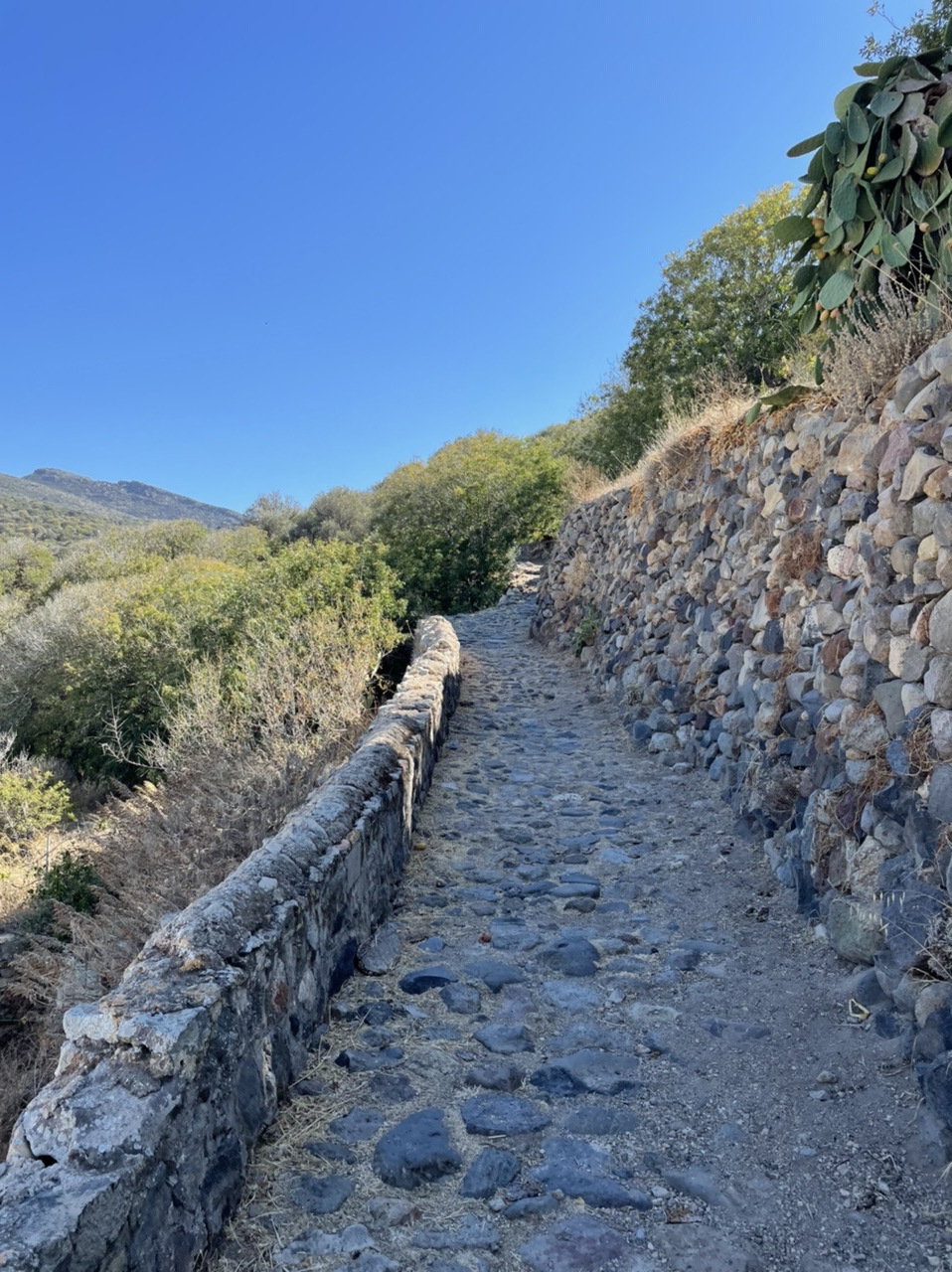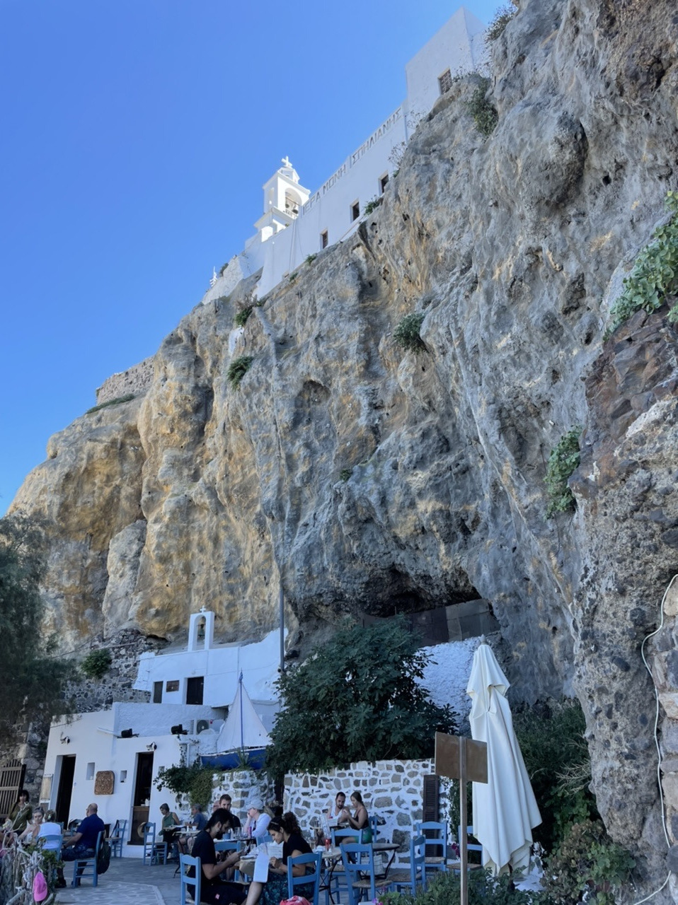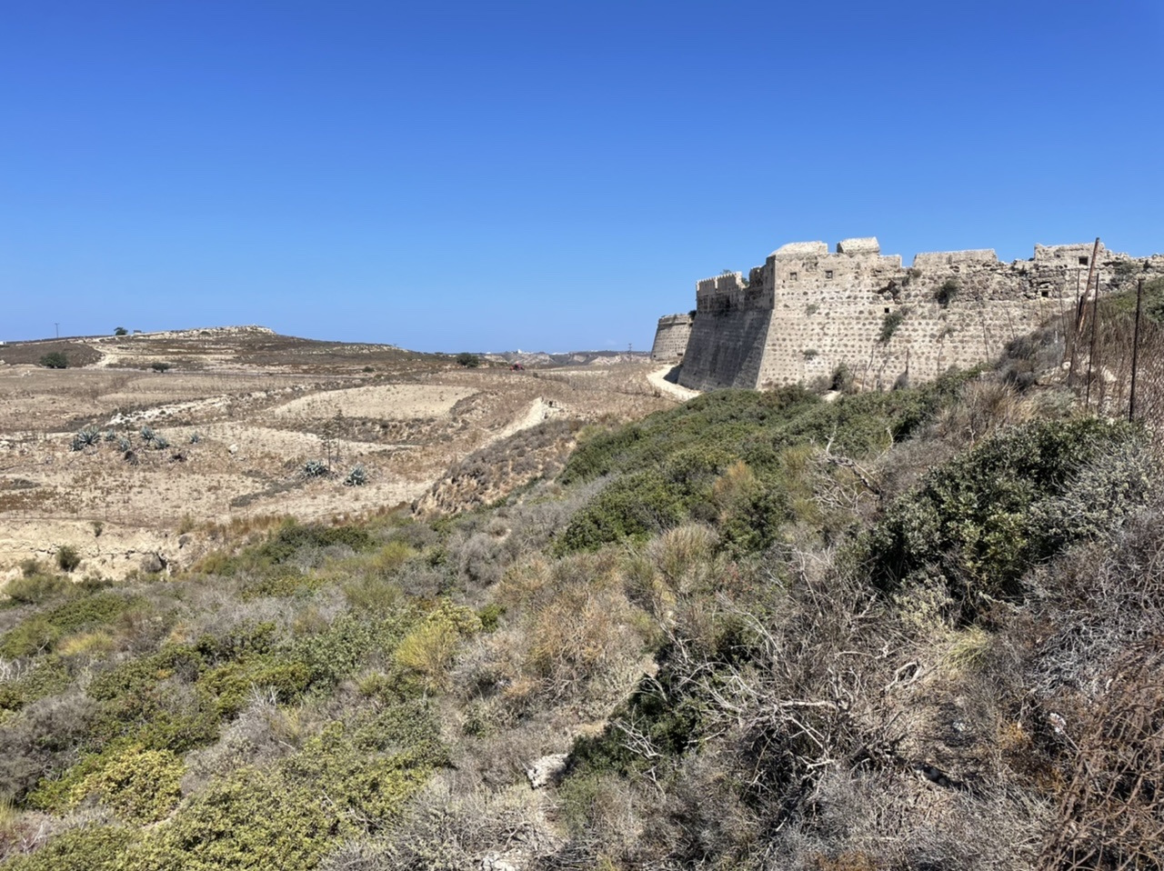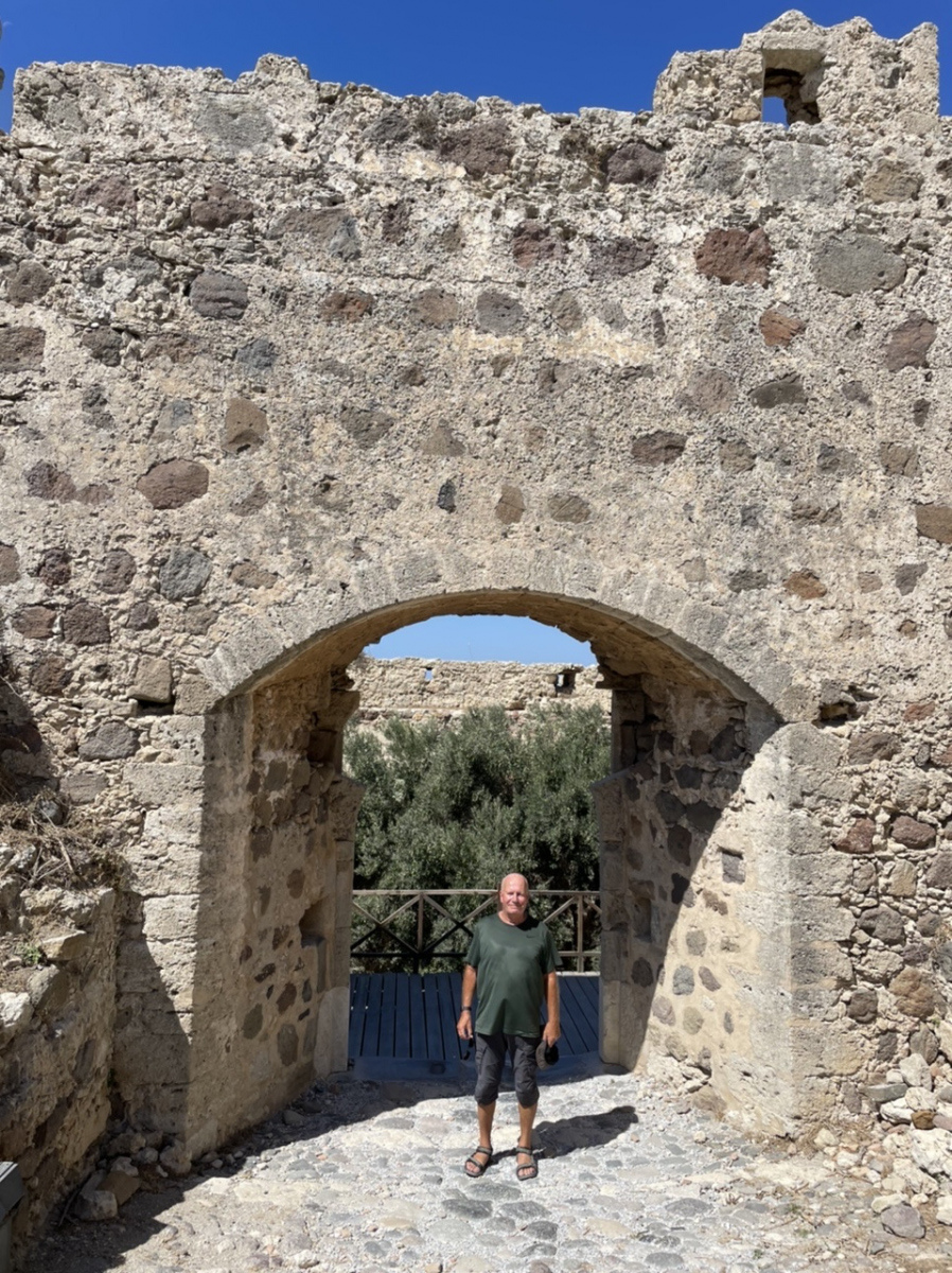 Above the village, a 5km walk through olive groves and bare macchia-grown rugged volcanic landscape inhabited only by goats, lies the Johannite fortress of Antimachia, with a wide view over the sea - and over the hotel castles. At the entrance is a Greek man in classic Efzone costume who explains some of the history to us.