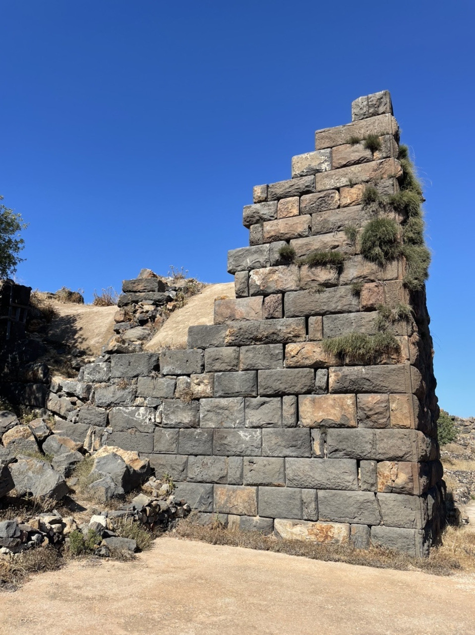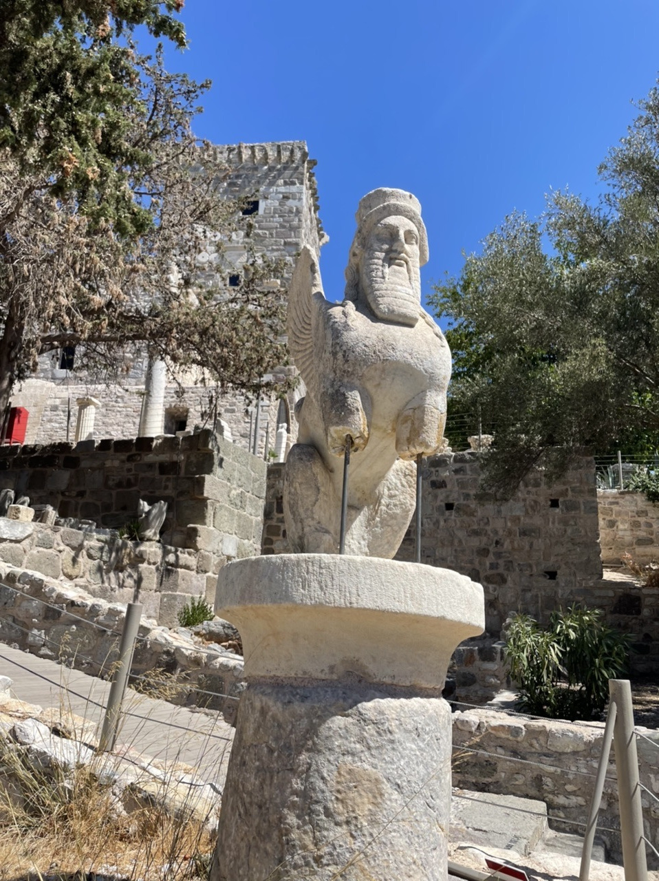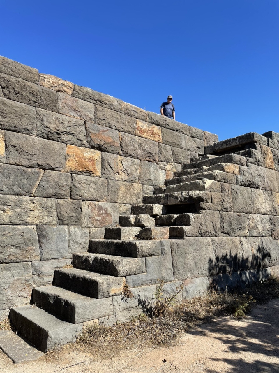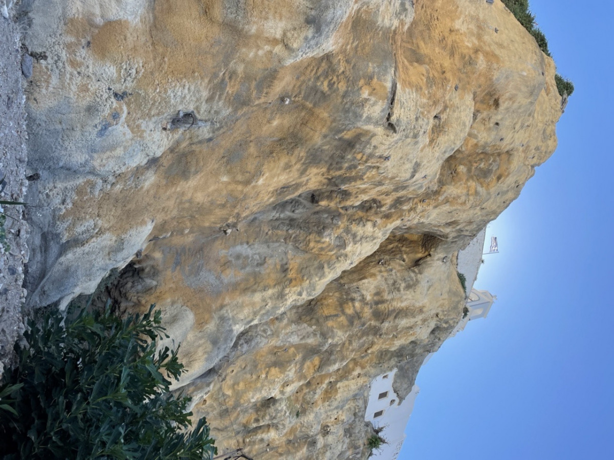 Above the village, a 5km walk through olive groves and bare macchia-grown rugged volcanic landscape inhabited only by goats, lies the Johannite fortress of Antimachia, with a wide view over the sea - and over the hotel castles. At the entrance is a Greek man in classic Efzone costume who explains some of the history to us.