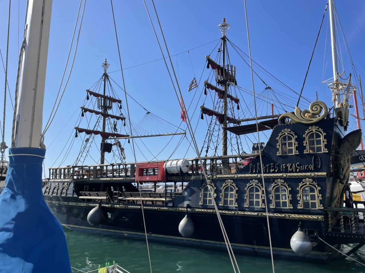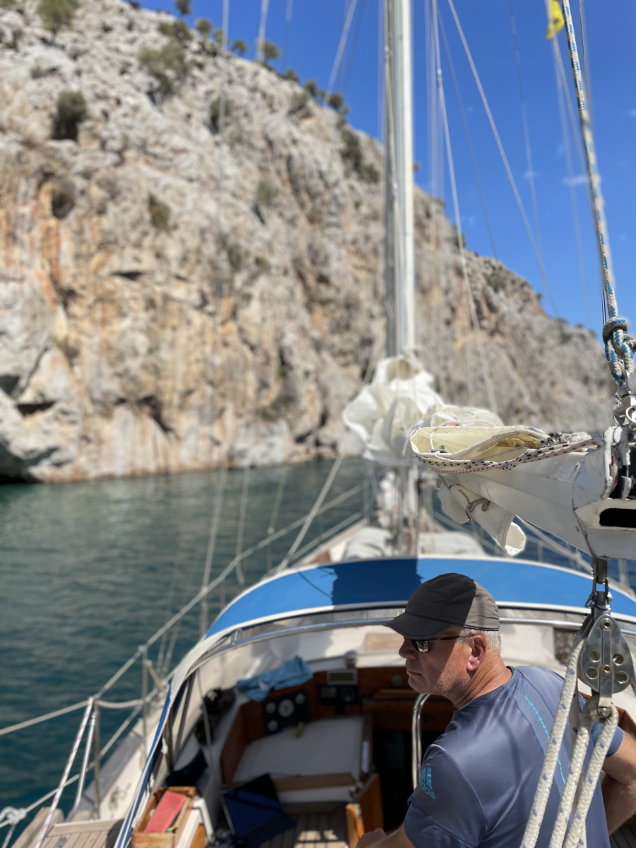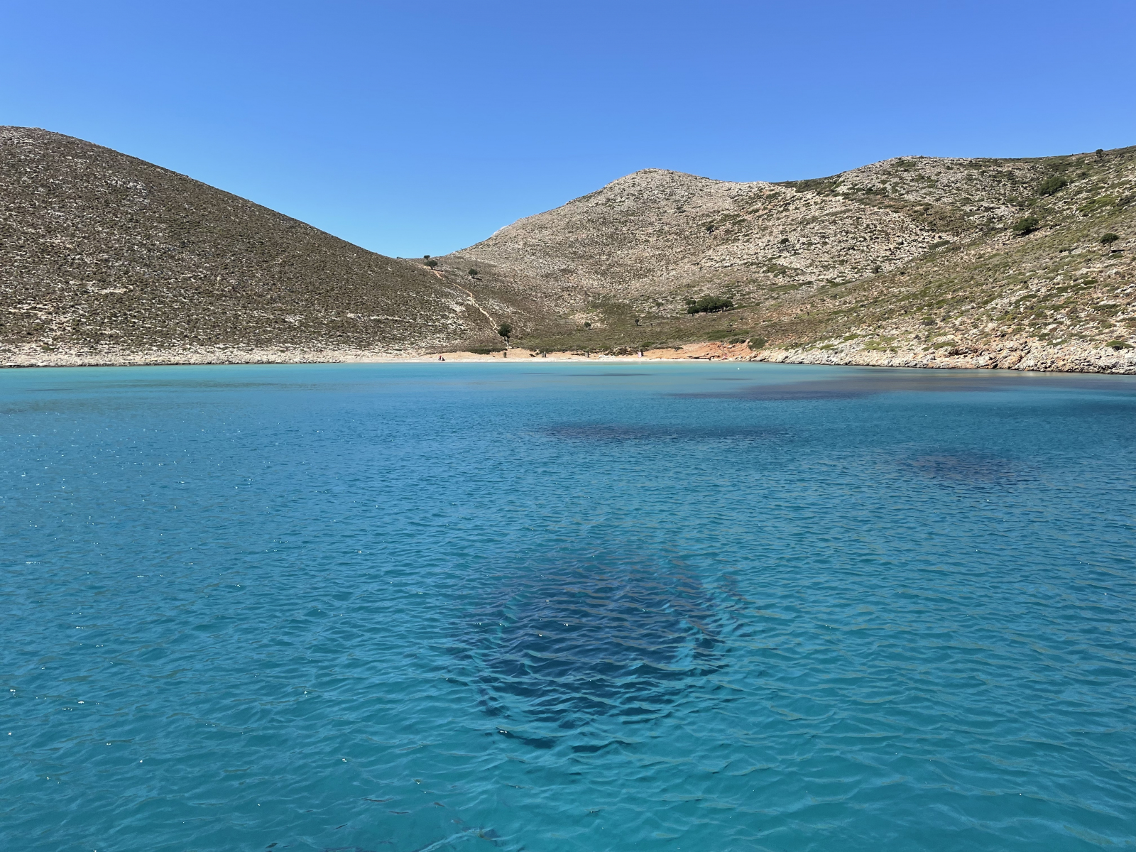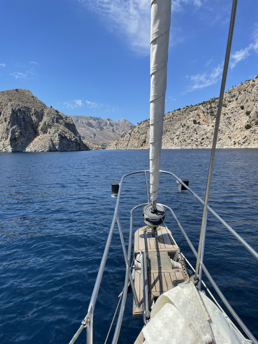 When we left for Astypaleia after a few days, we had to leave (early because of the long distance) before the excursion ships styled as pirate ships and it came as it had to: an excursion ship had laid its anchor over our chain when mooring the evening before and we were stuck. Gisela, who now has a lot of experience with anchor salad in Vathys on Kalymnos, directed our boat, which was stuck in the harbour, forwards, backwards, to the right and to the left until our anchor had slid out from under the other chain. Meanwhile, the captain of the excursion boat stood on his bridge and watched the spectacle. After half an hour we were free and off we went towards Astypaleia.