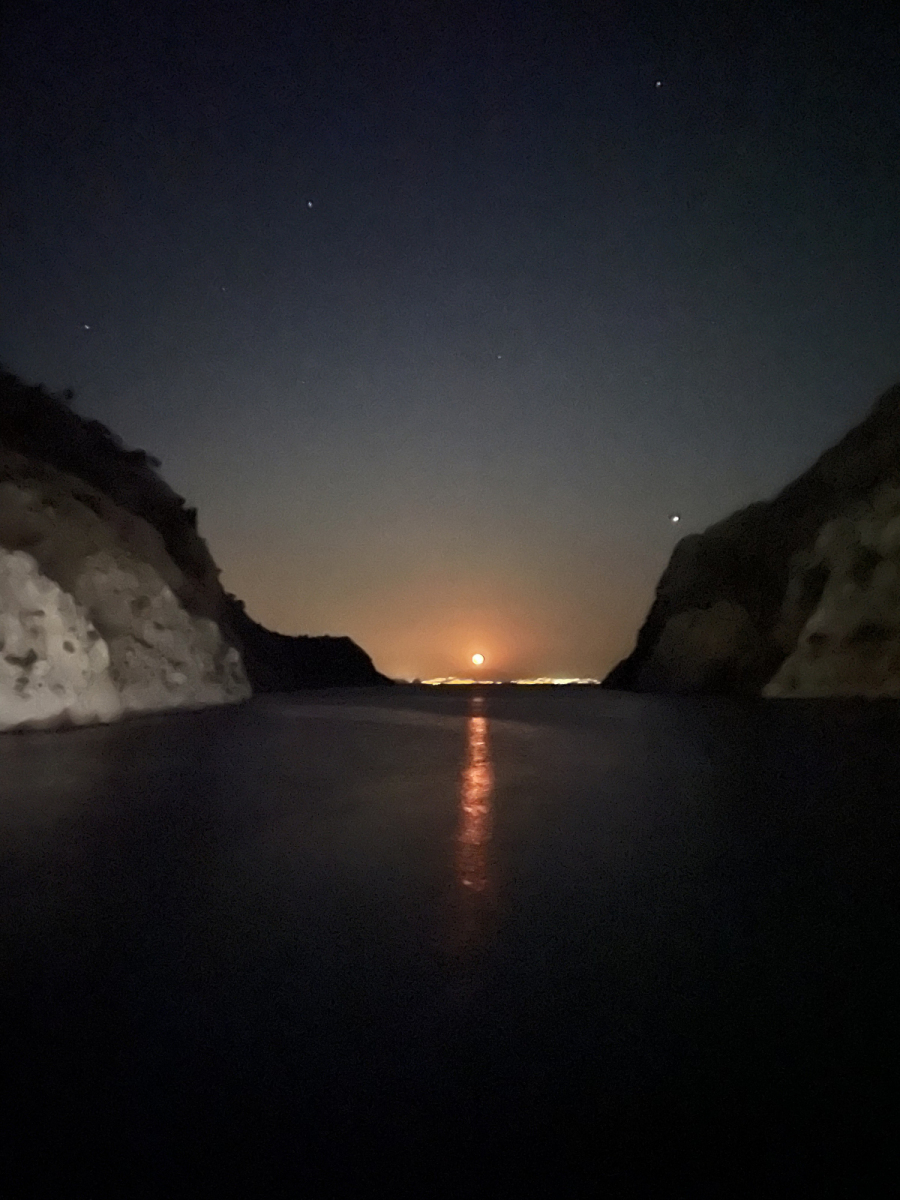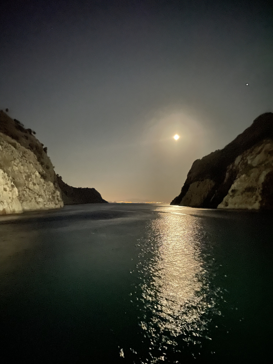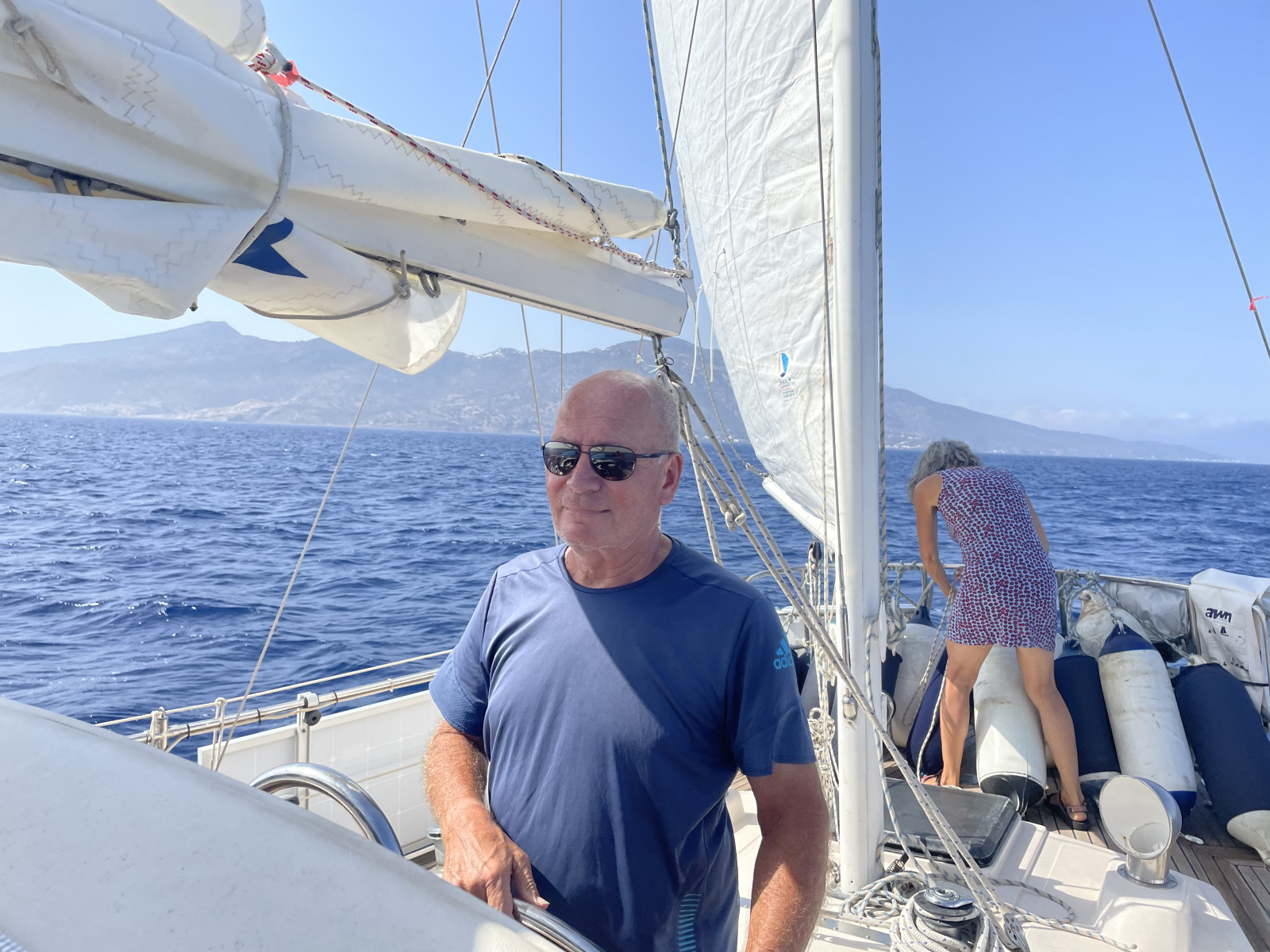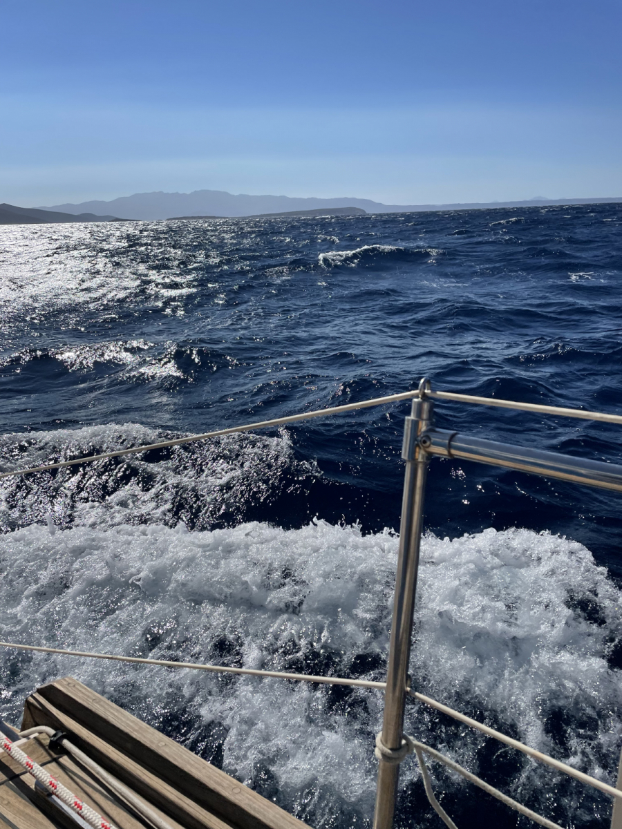 When we left for Astypaleia after a few days, we had to leave (early because of the long distance) before the excursion ships styled as pirate ships and it came as it had to: an excursion ship had laid its anchor over our chain when mooring the evening before and we were stuck. Gisela, who now has a lot of experience with anchor salad in Vathys on Kalymnos, directed our boat, which was stuck in the harbour, forwards, backwards, to the right and to the left until our anchor had slid out from under the other chain. Meanwhile, the captain of the excursion boat stood on his bridge and watched the spectacle. After half an hour we were free and off we went towards Astypaleia.